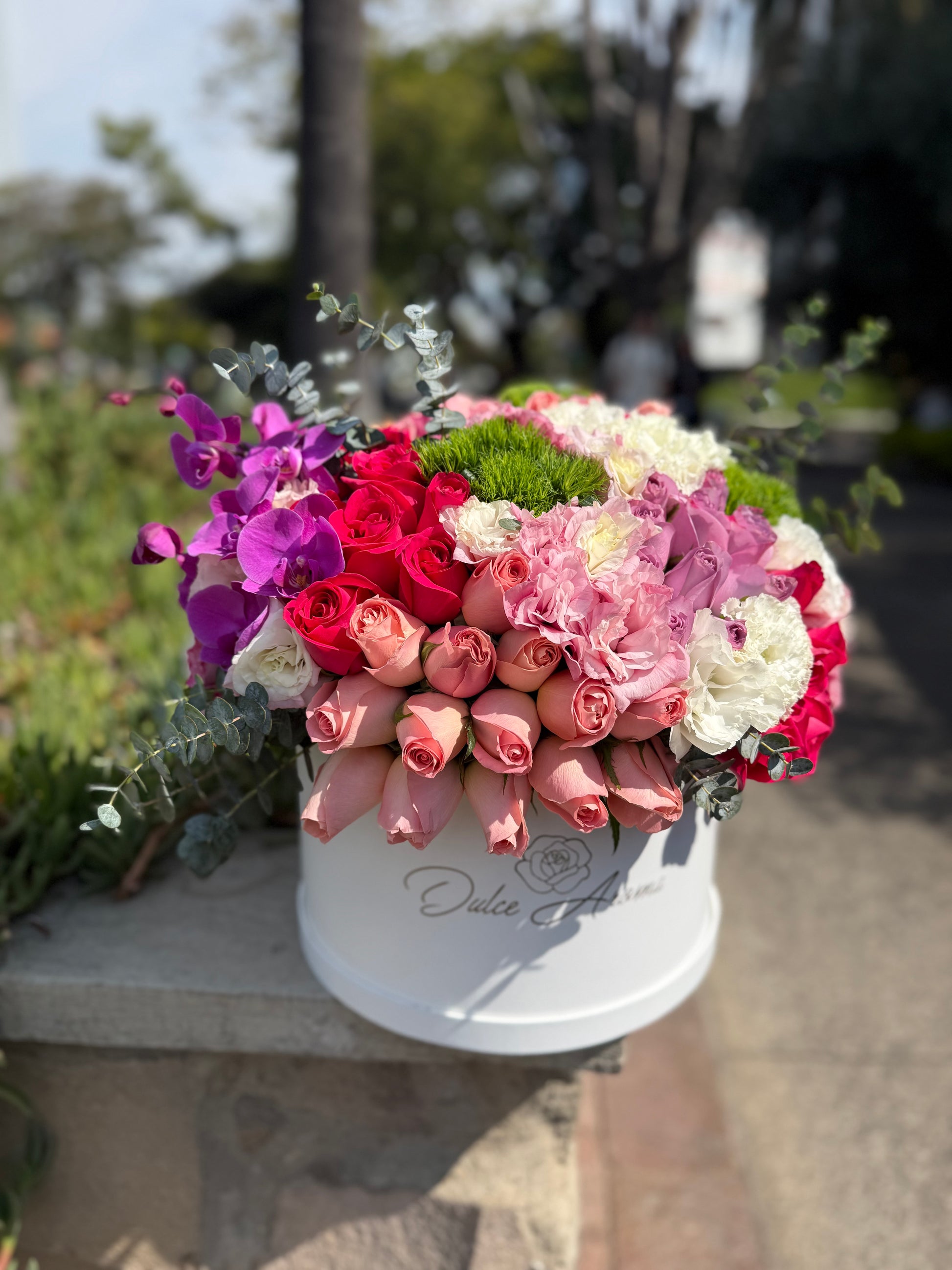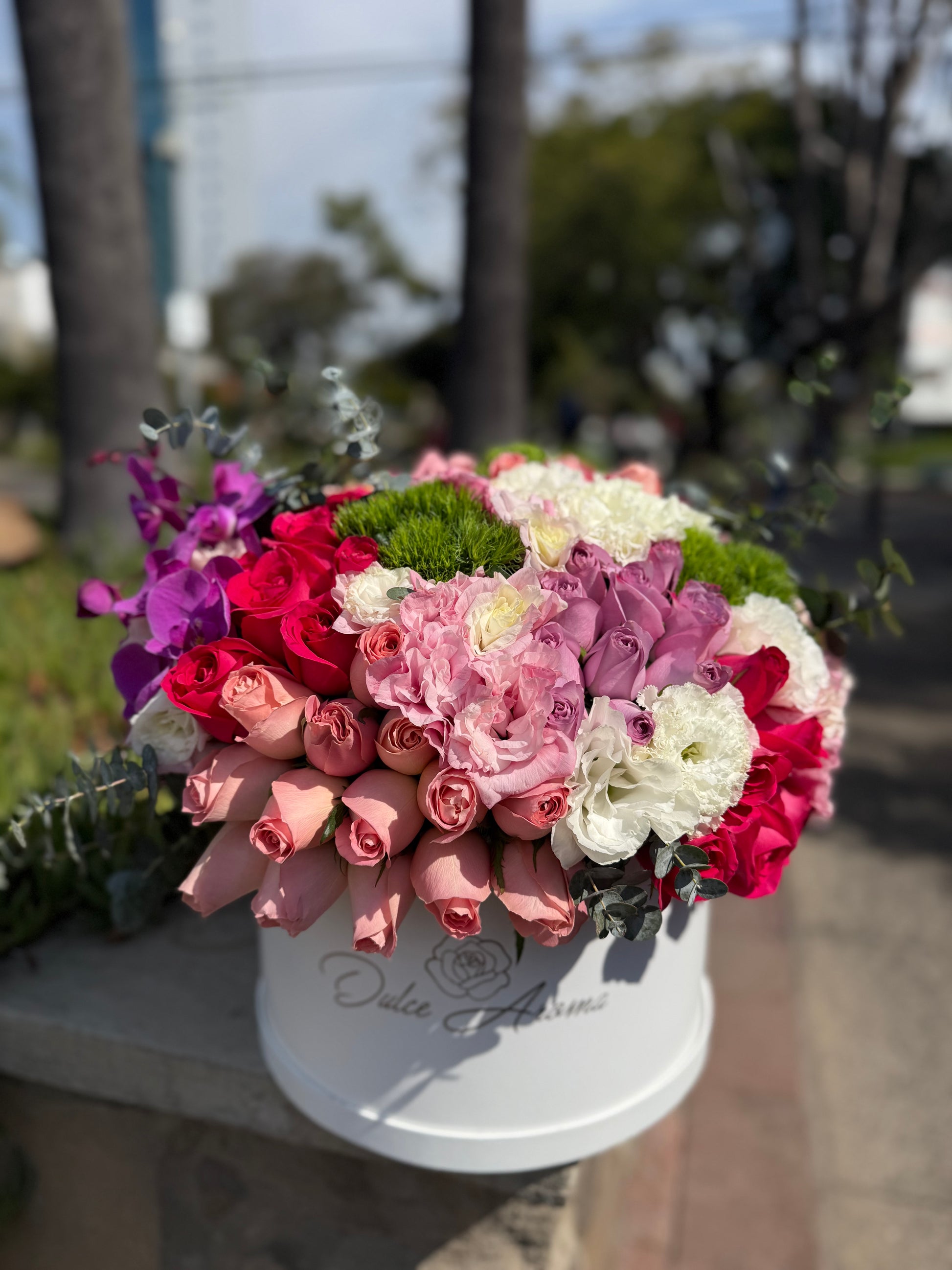 Caja circular 30 cm blanca, media esfera, con rosas, lisianthus, orquídeas y follajes