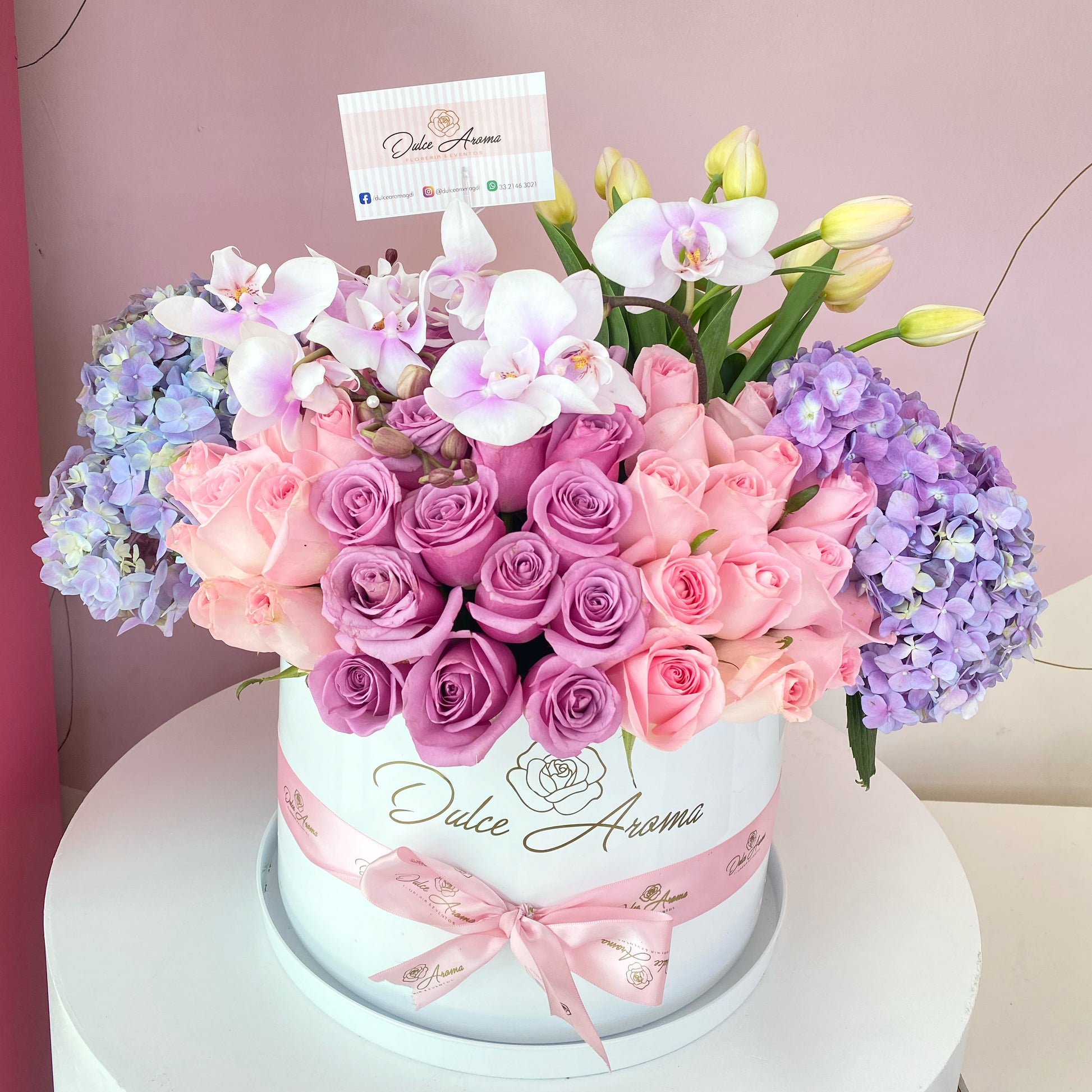 Circular esfera 30 cm blanca con rosas, hortencias, orquídeas y tulipanes