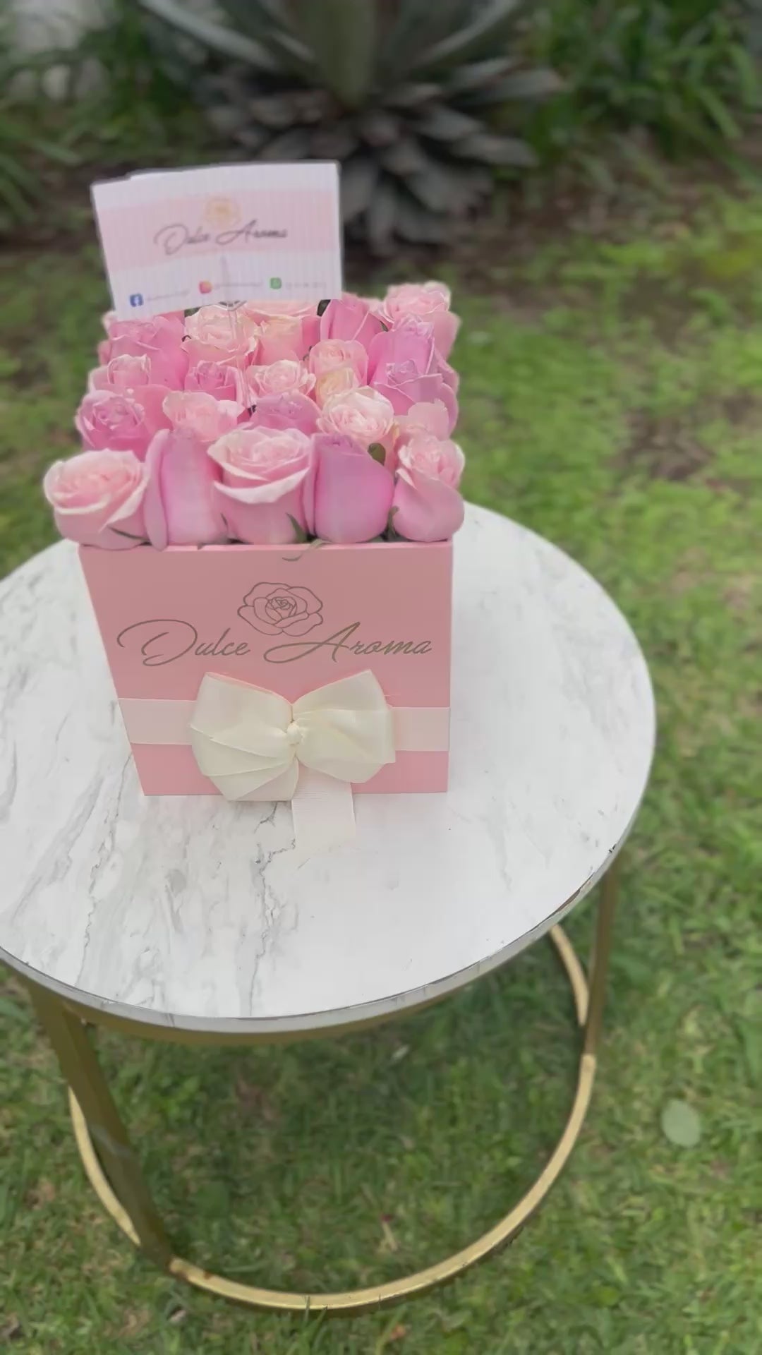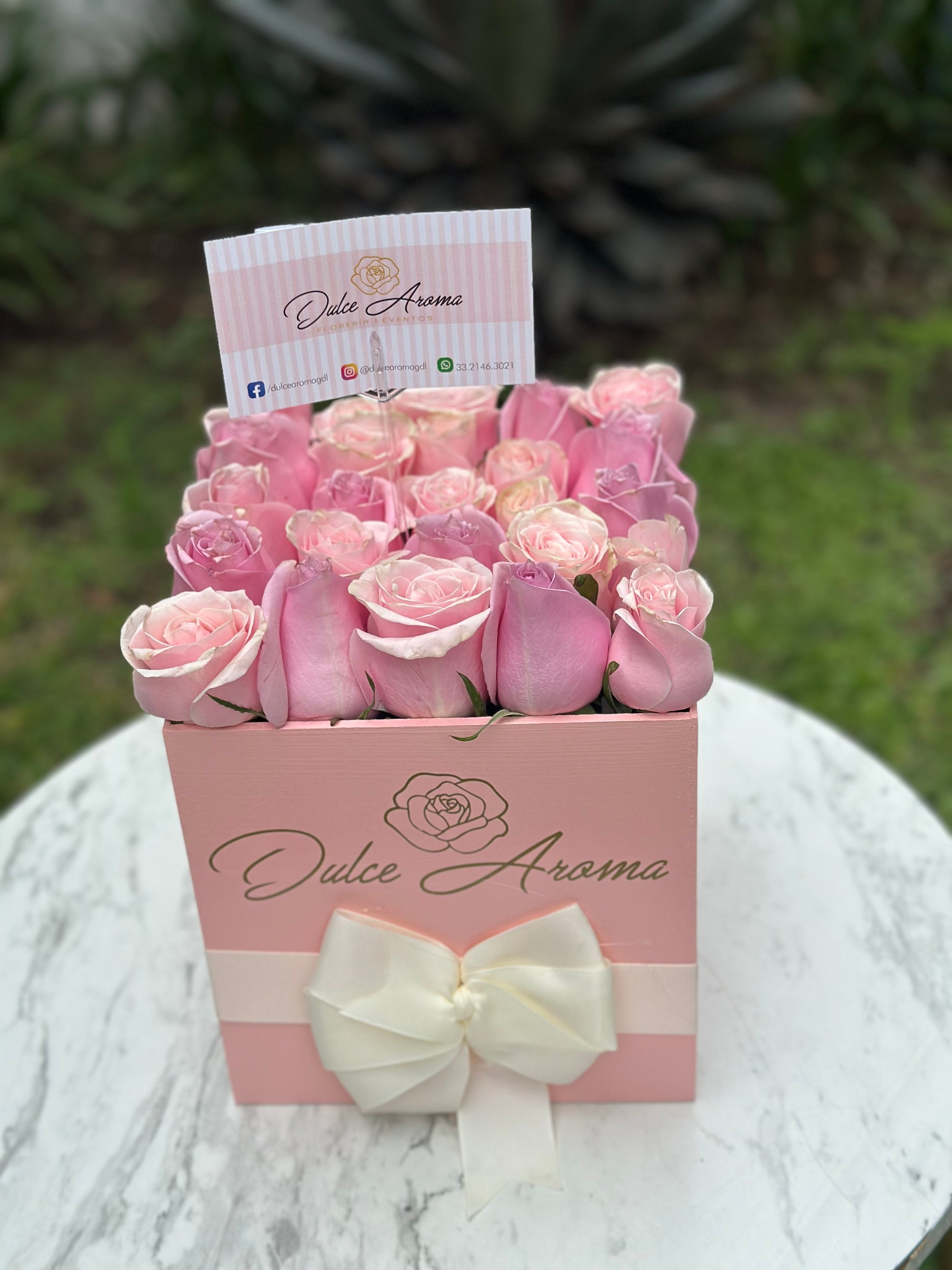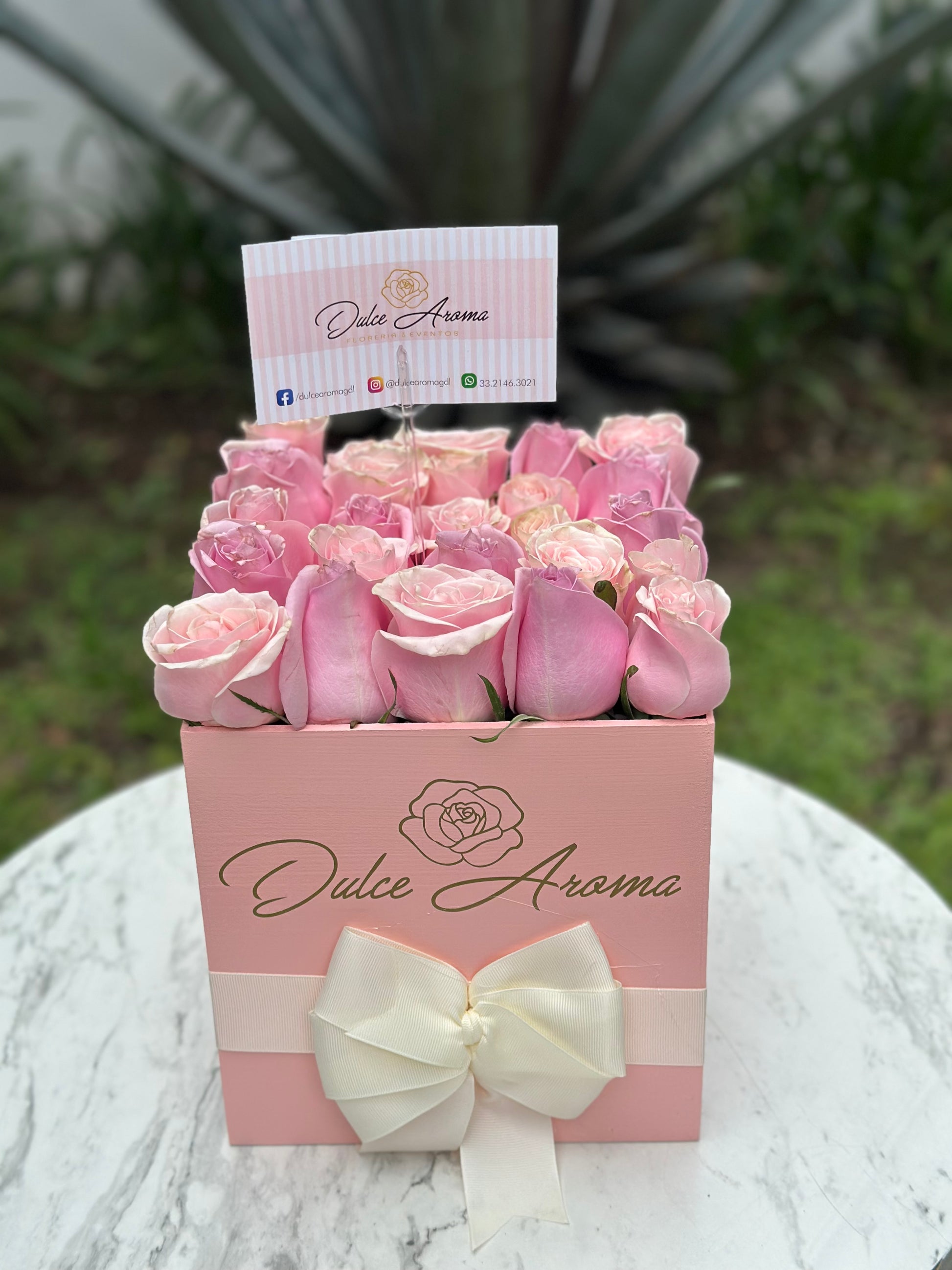 Caja cuadrada 20 cm color rosa, con aproximadamente 25 rosas en pave tonos rositas