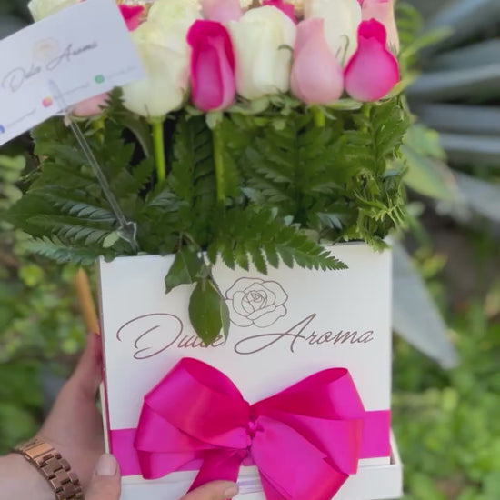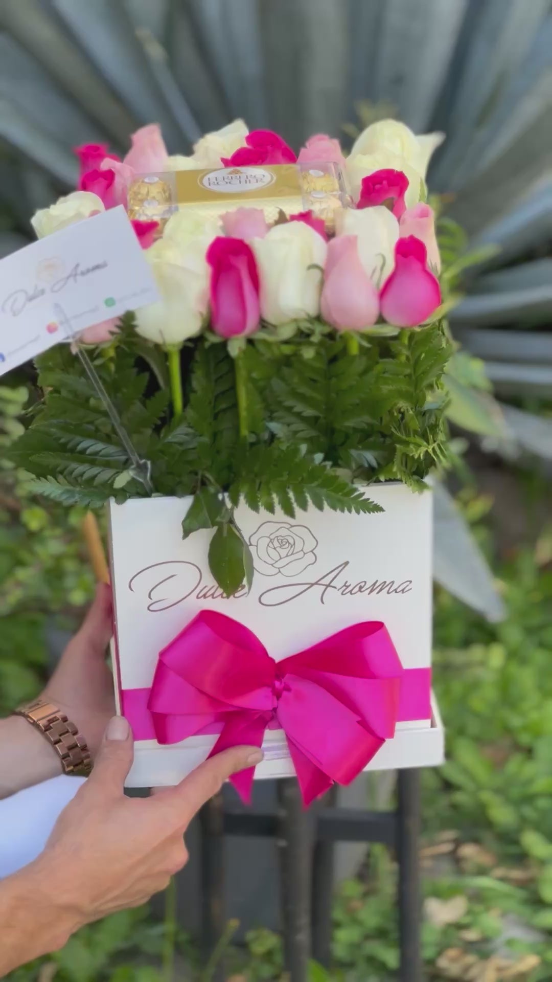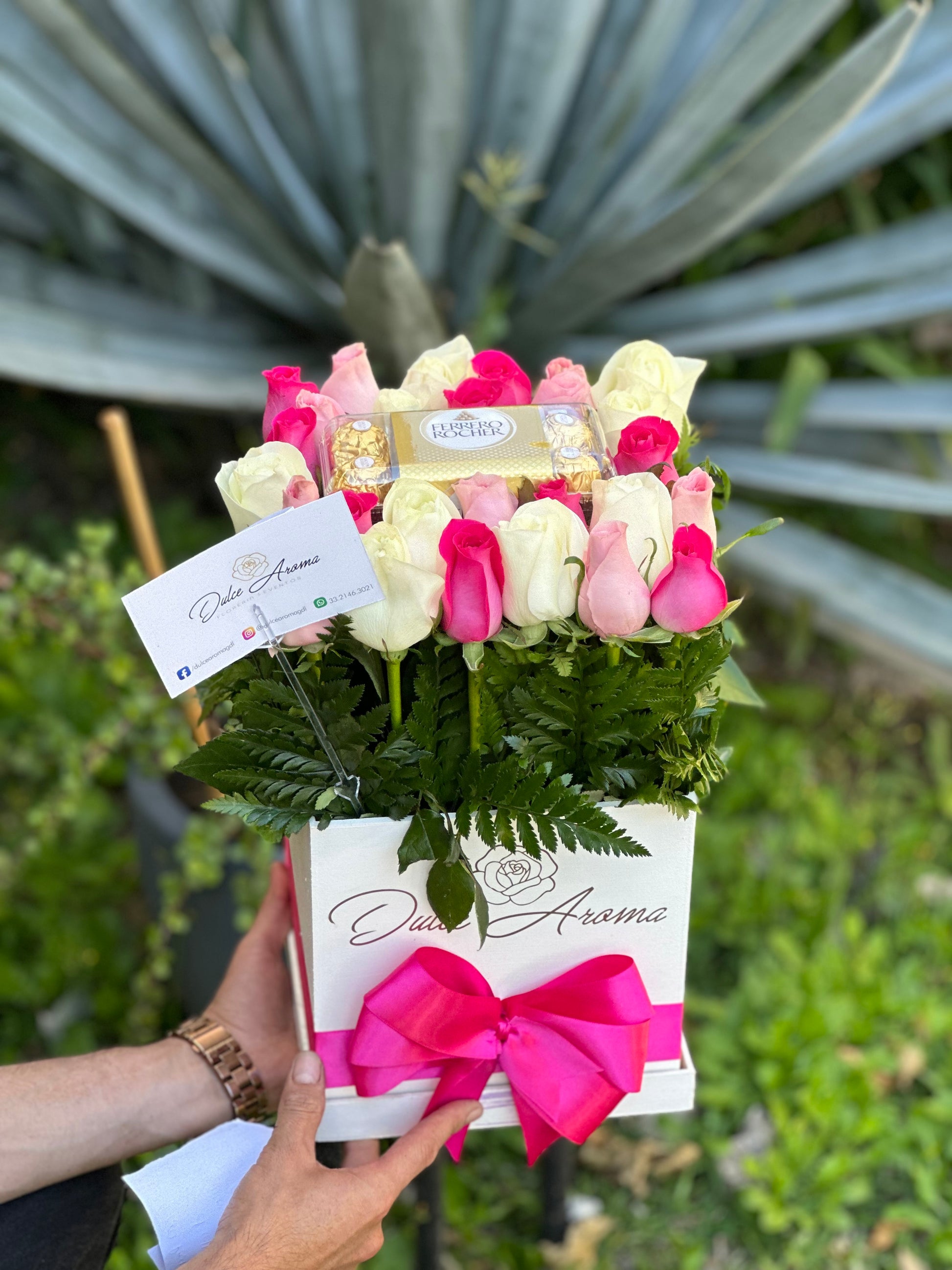 Caja cuadrada 20 cm blanca, rosa altas con ferreros