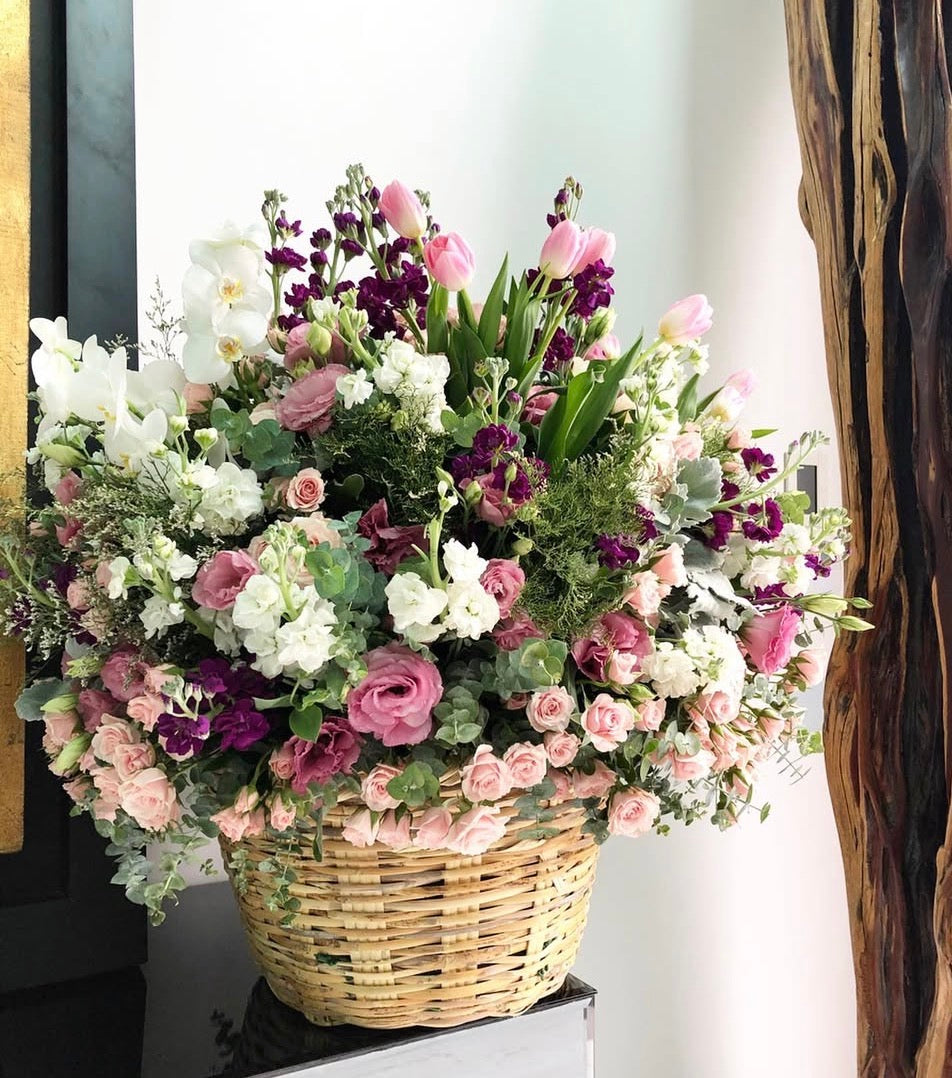 Canasta con variedad de flor como mini rosas, lisianthus, alelis, tulipanes, orquídeas y follajes
