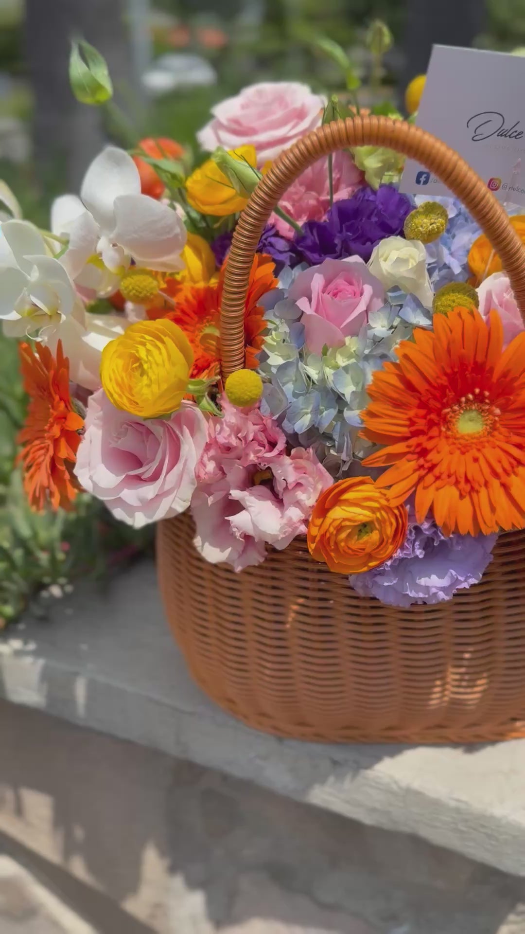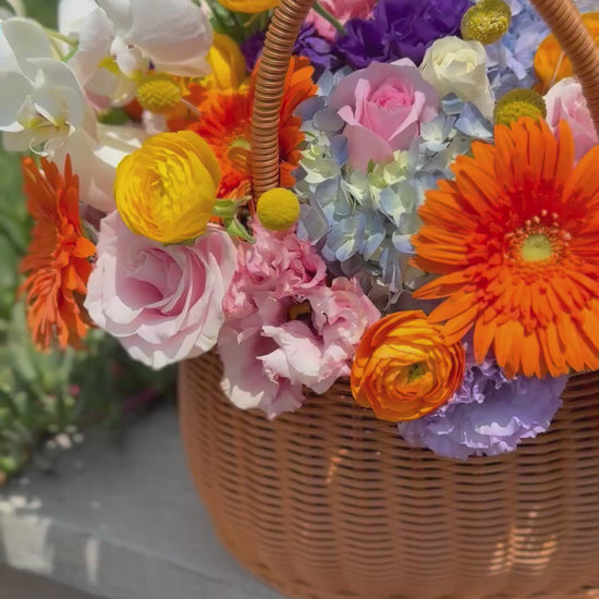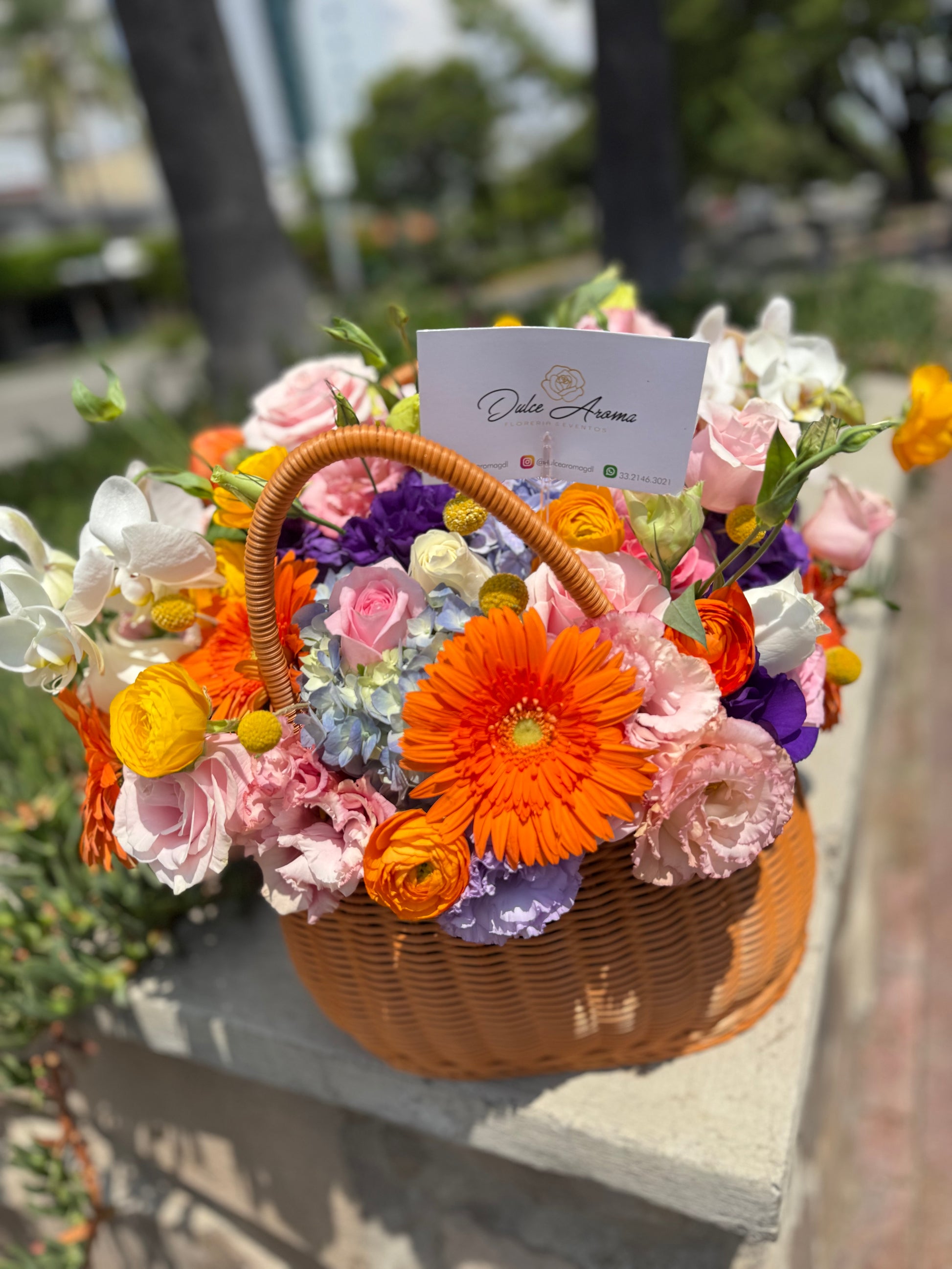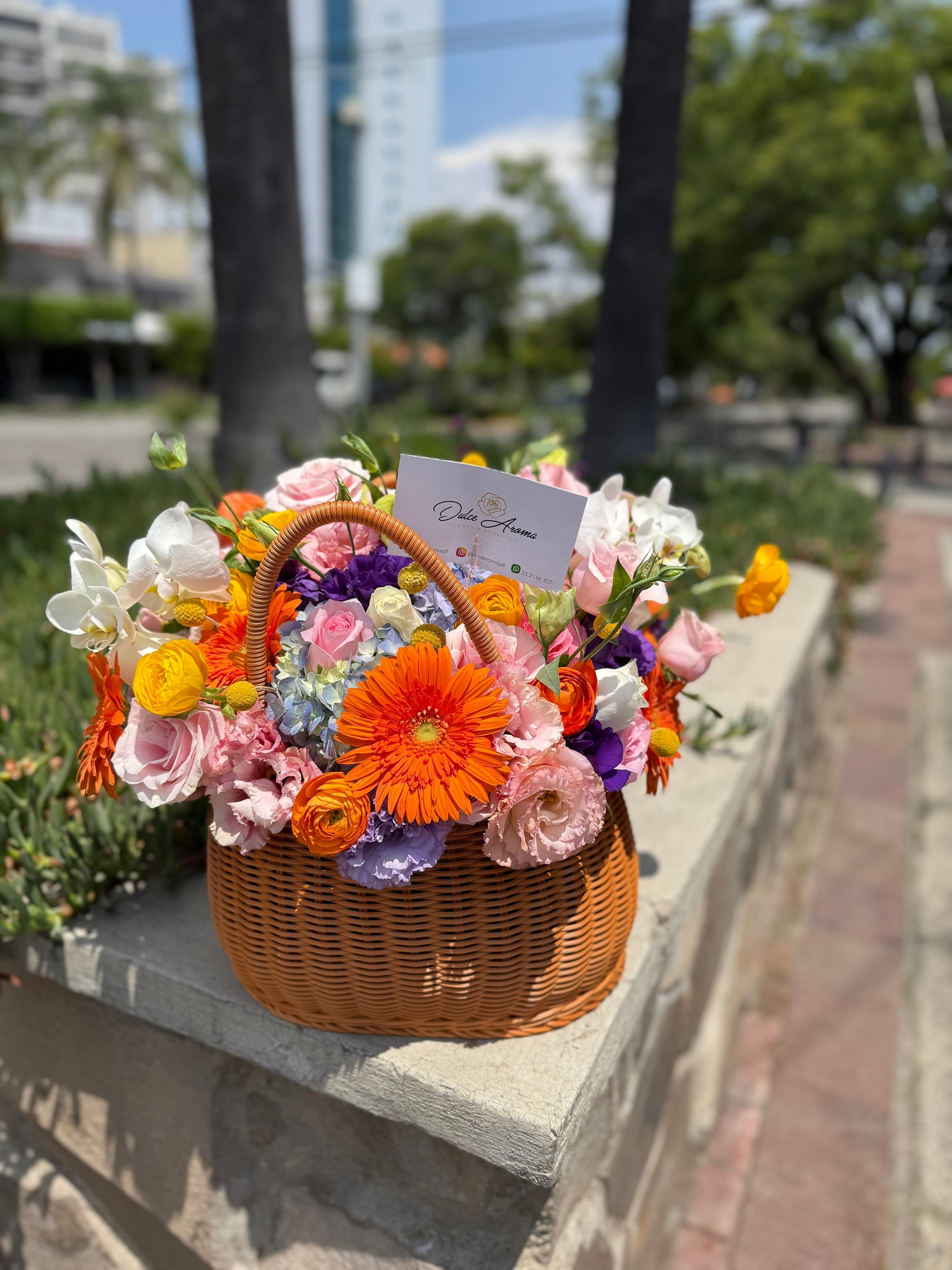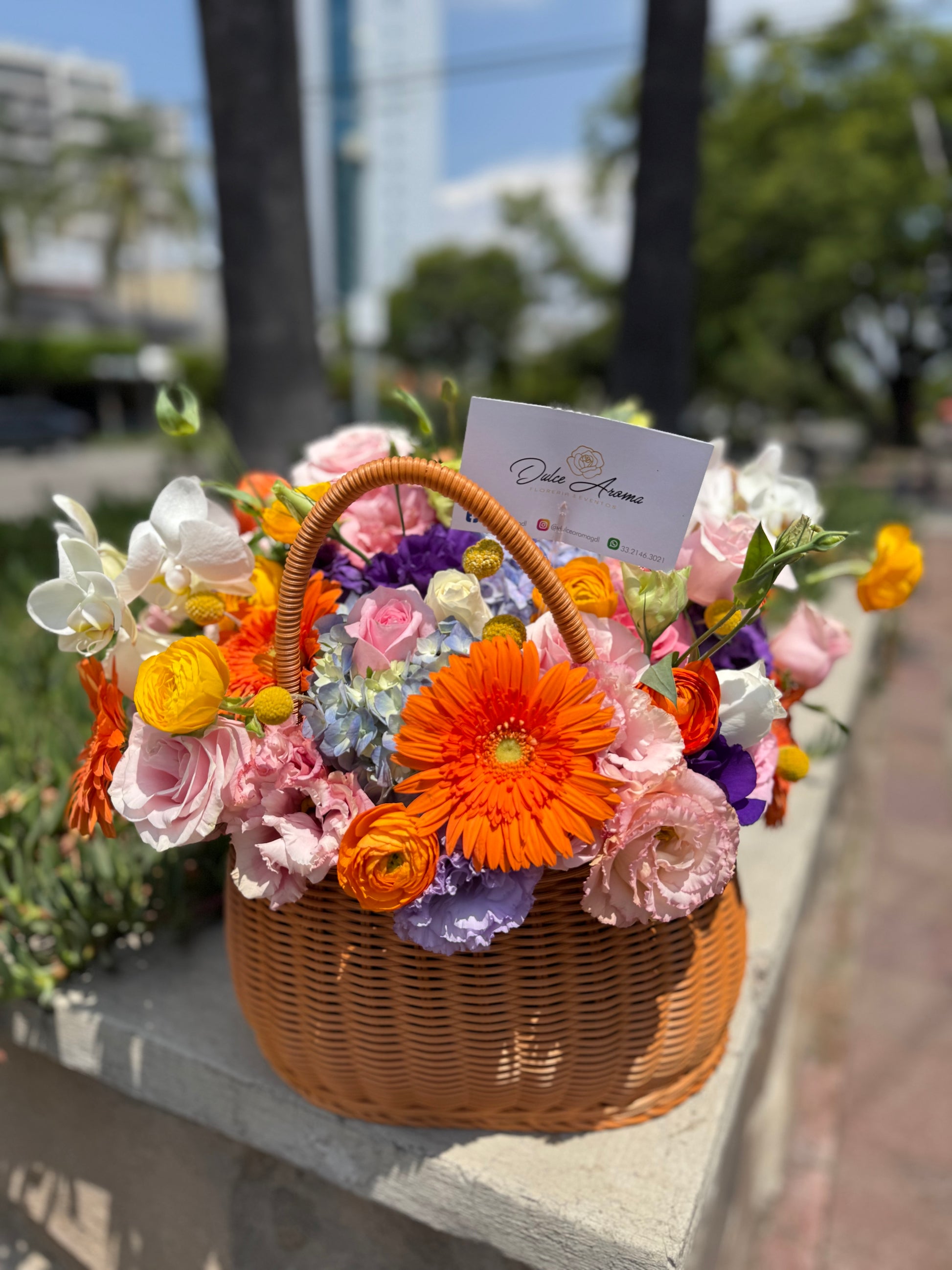 Esfera de flores finas, contiene orquídeas, rosas inglesas, ranúnculos, gerberas, hortenciasy rosas