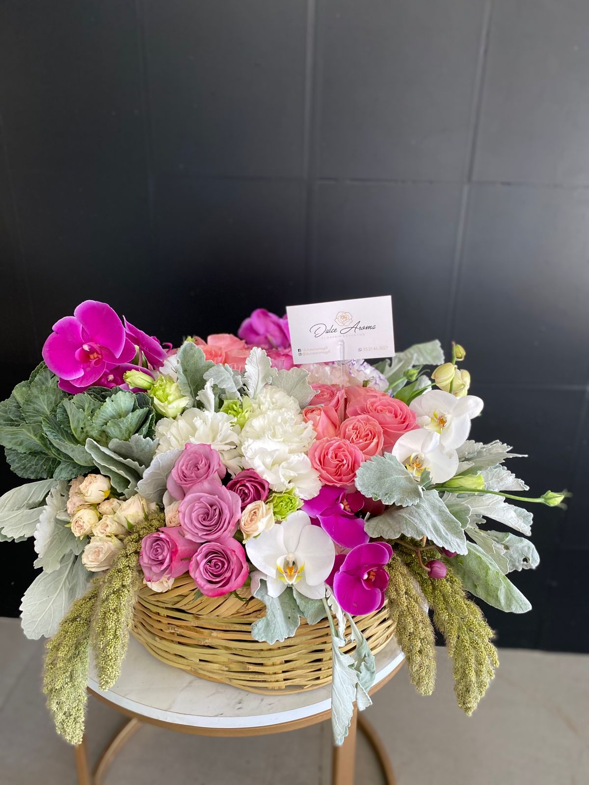 Canasta con variedad de flor, rosas, mini rosas, lisianthus y orquídeas, con follajes