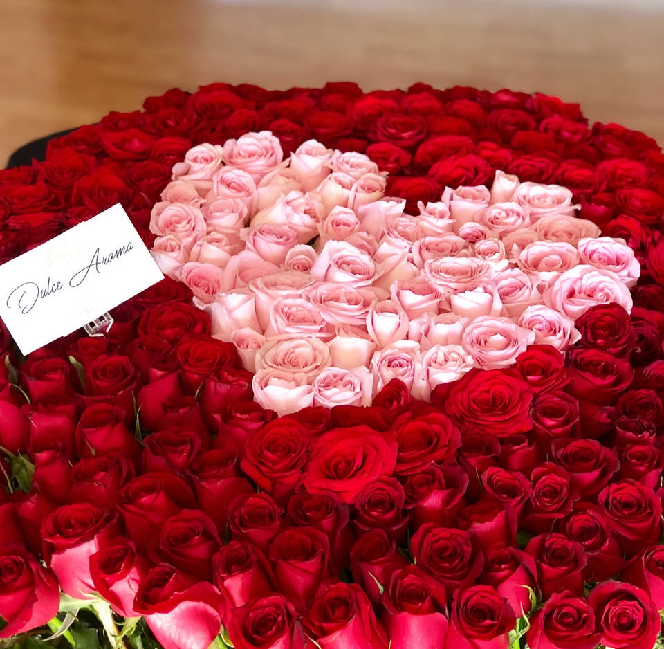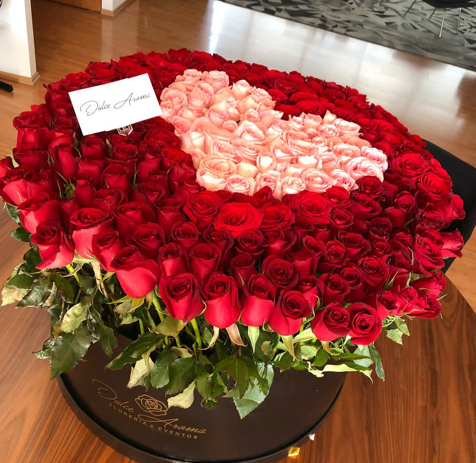Caja circular 50 cm negra rosa roja y corazón en medio rosa aproximadamente 280 rosas