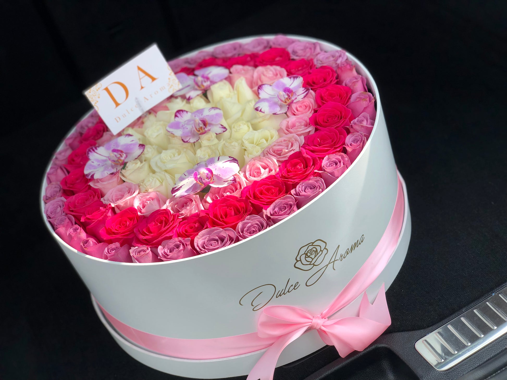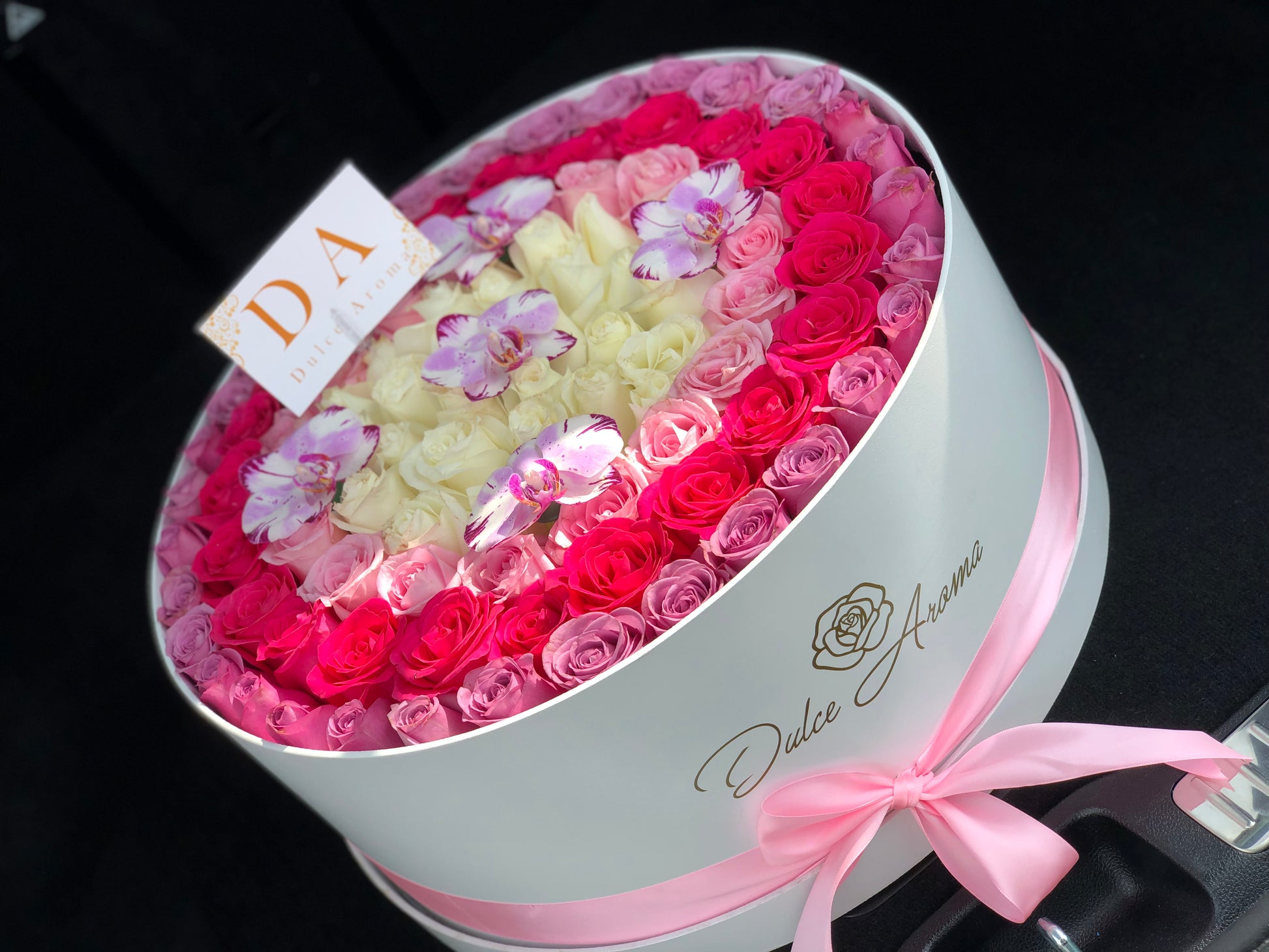 Caja circular 50 cm con 180 rosas aproximadamente y orquídeas