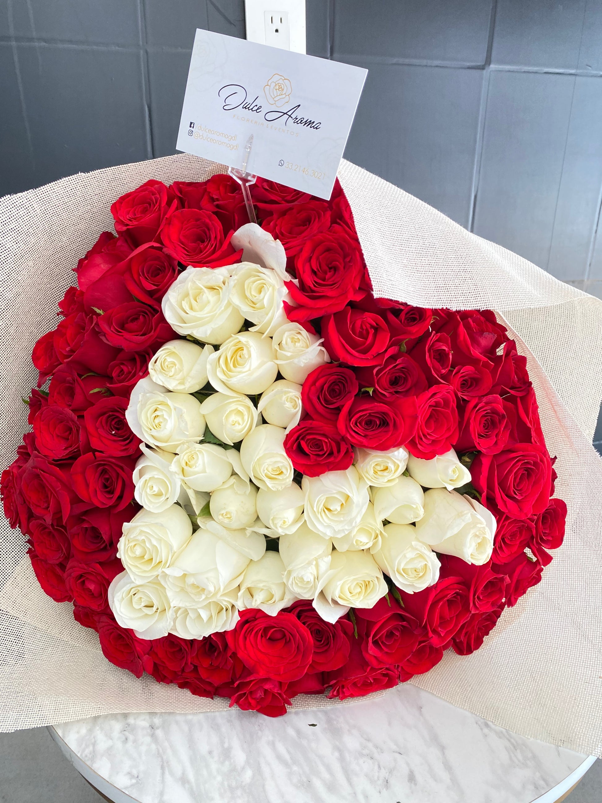 Ramo 100 rosas rojas en medio corazón blanco envoltura yute