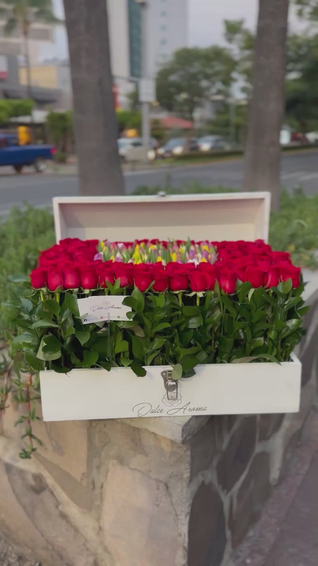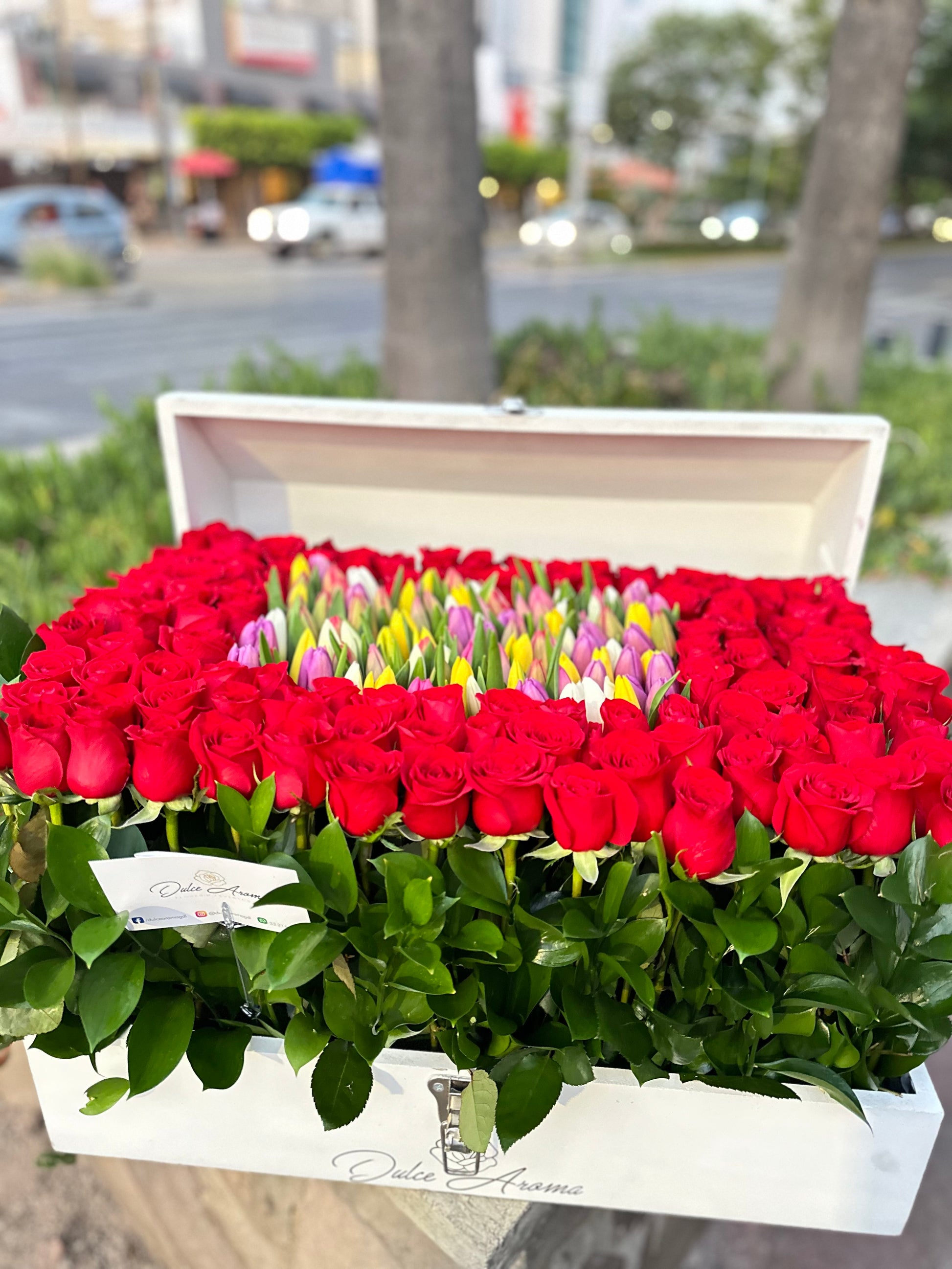 Cofre jumbo blanco, 100 tulipanes coloridos y rosas