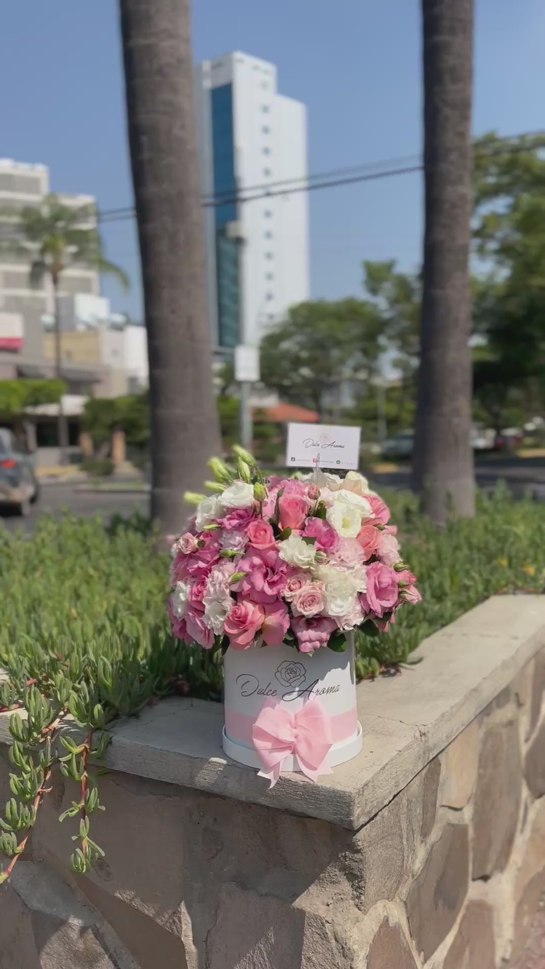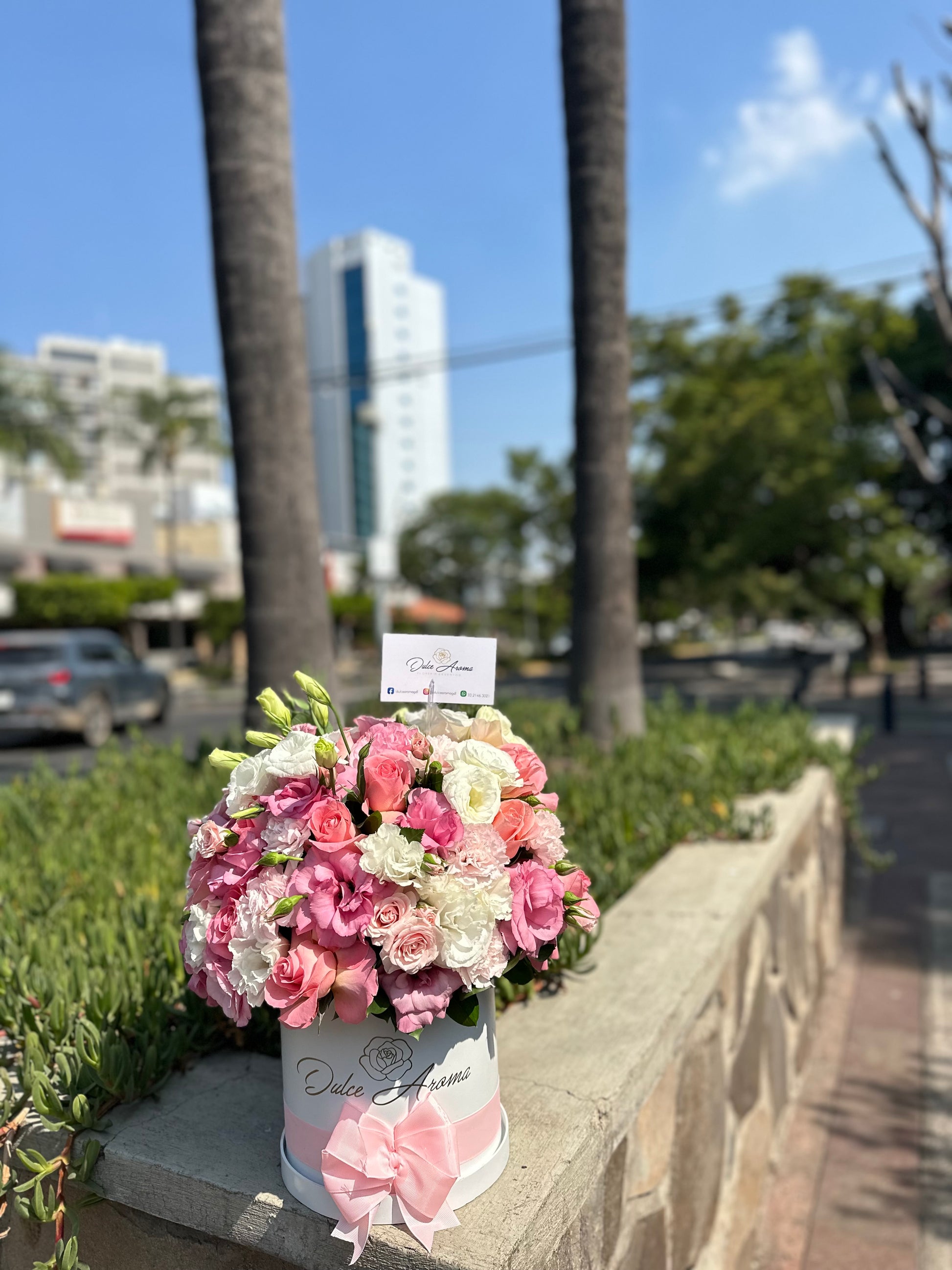 Cilindro chico blanco rosas, lisianthus y claves, media esfera