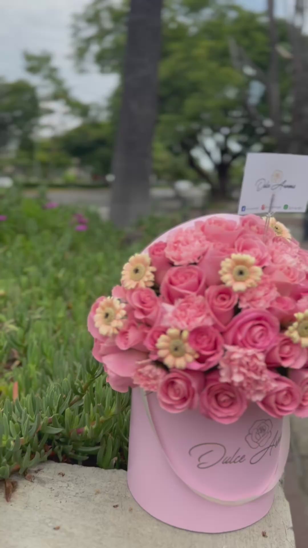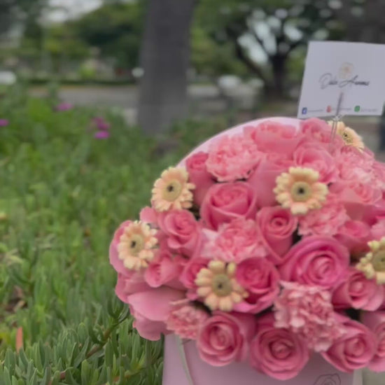 Caja circular mini rosa media esfera rosas hermosa, claveles y mini gerberas