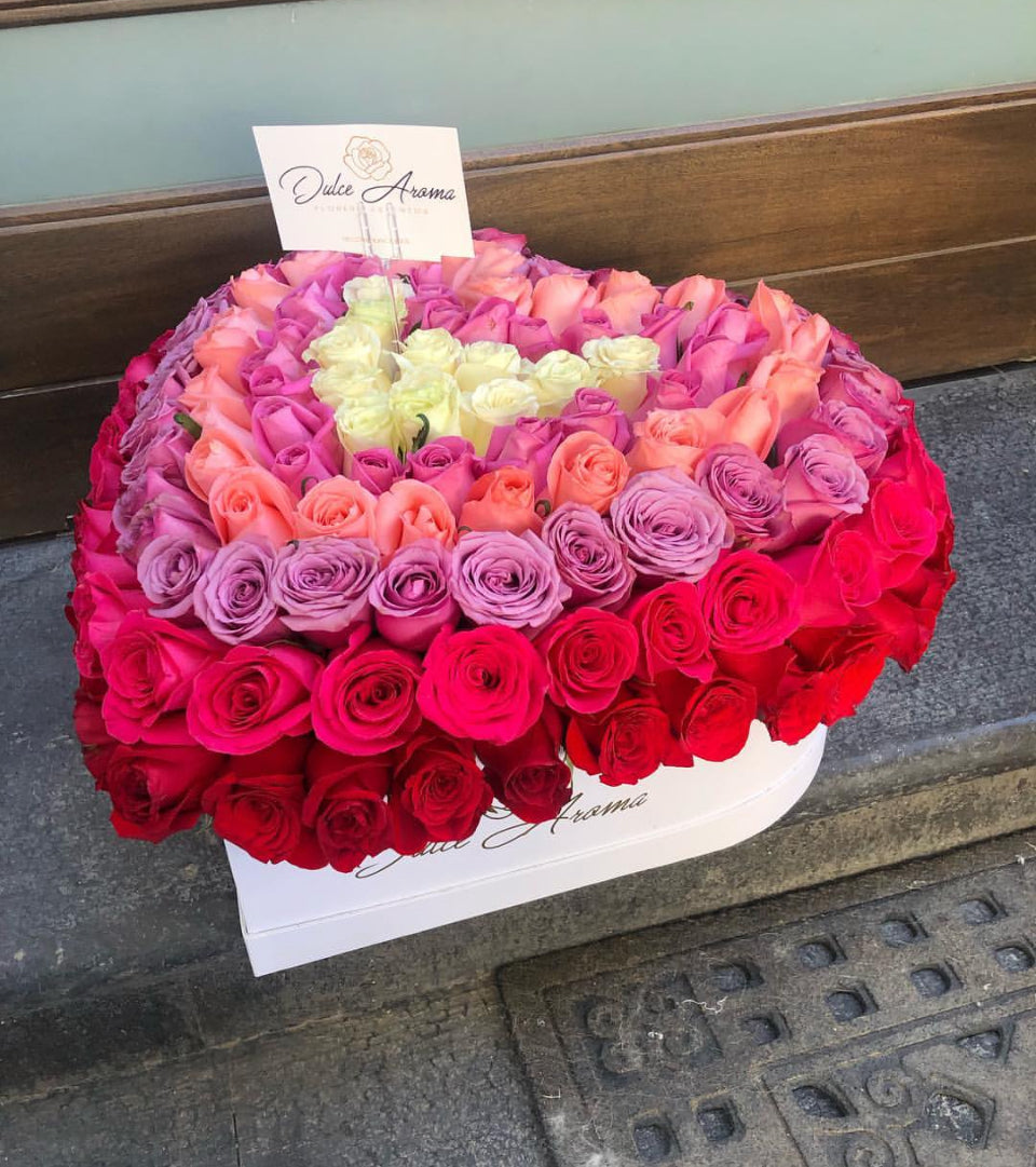 Caja corazón chico blanco con 125 rosas aproximadamente en degradación