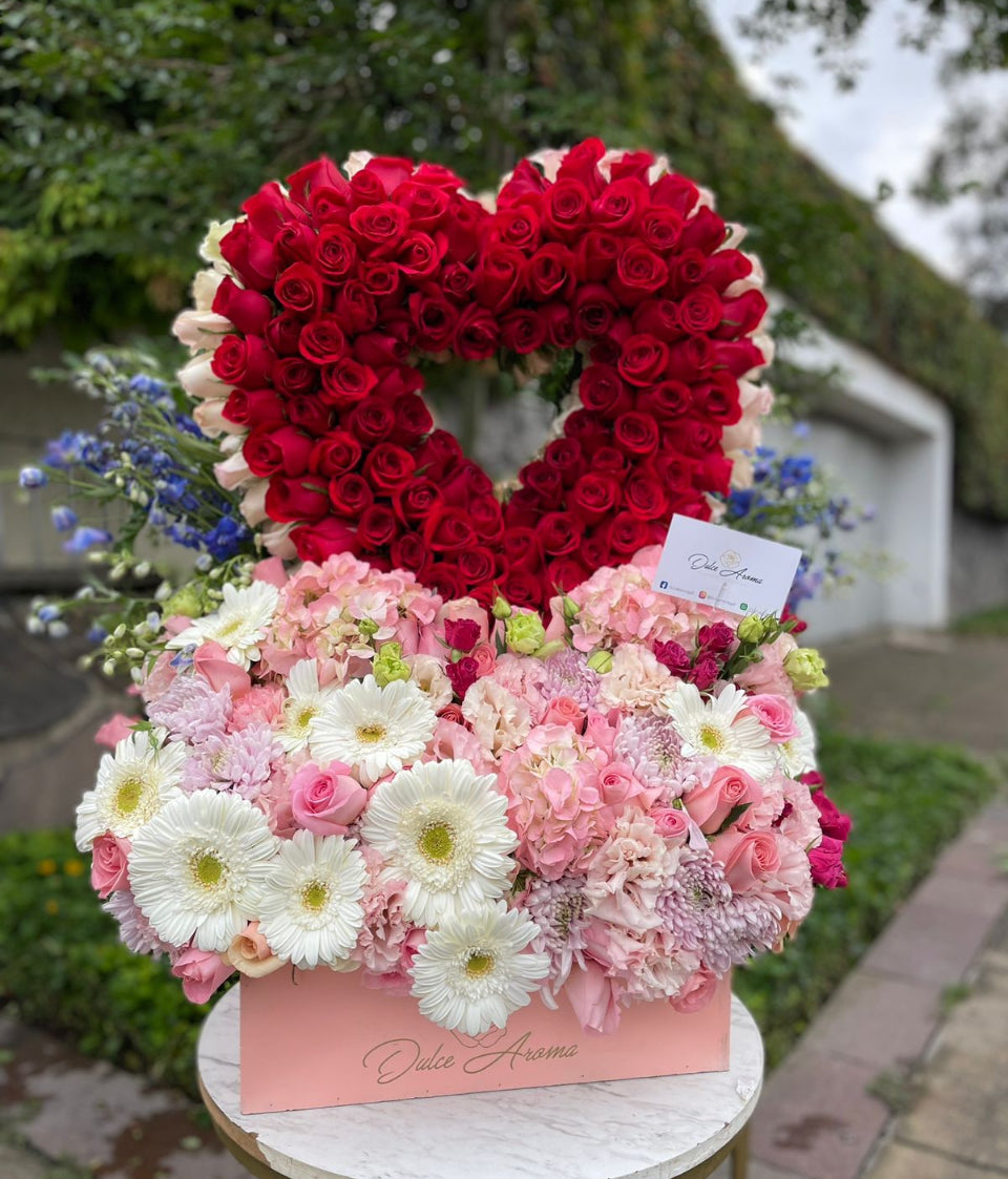 Caja cuadrada con corazón en 3D sobre una base de mix de flores premium
