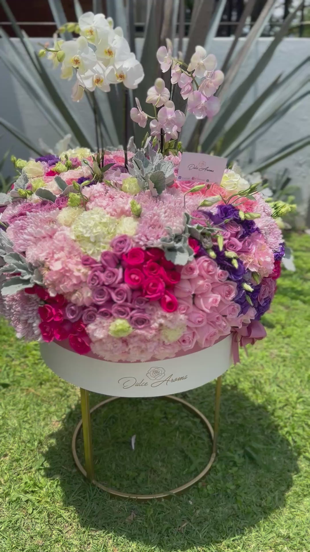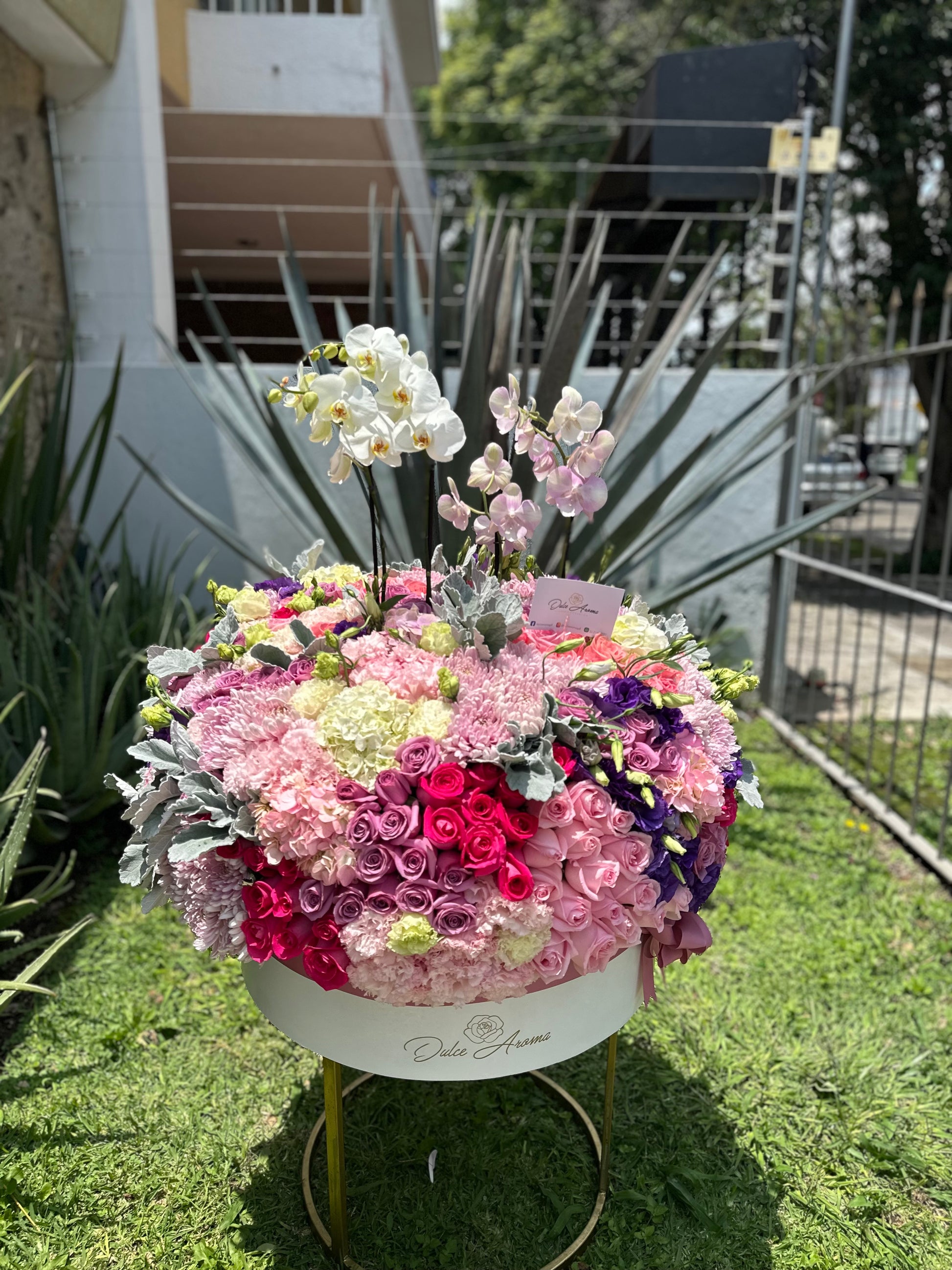 Caja circular 60 cm con rosas y variación de flores y orquídeas