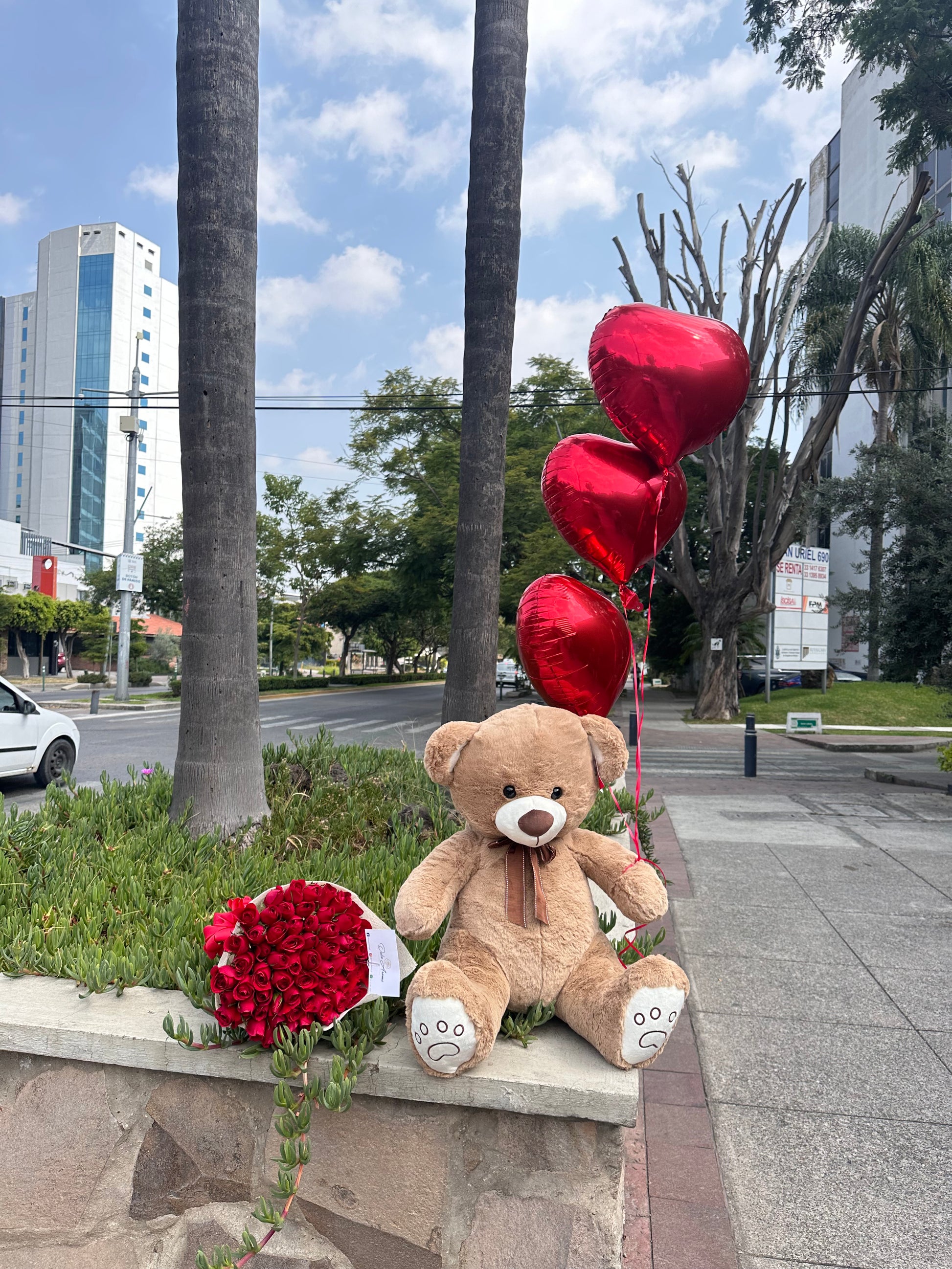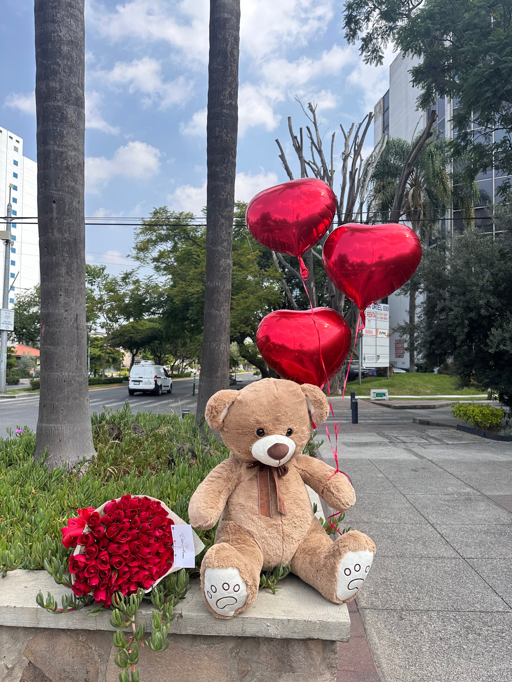Oso de peluche, ramo 50 rosas y 3 globos de corazón