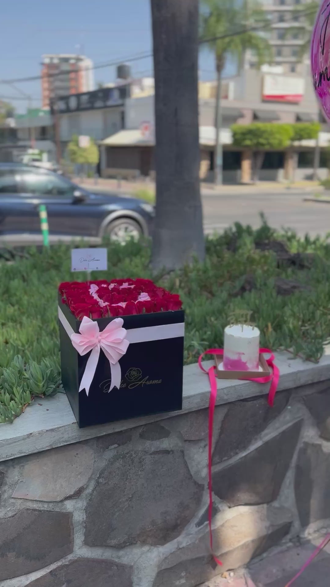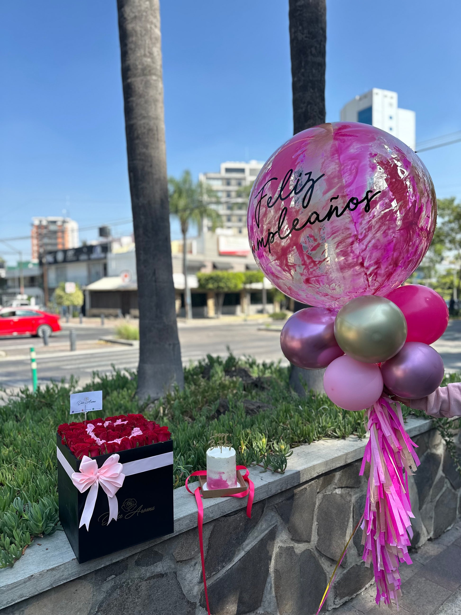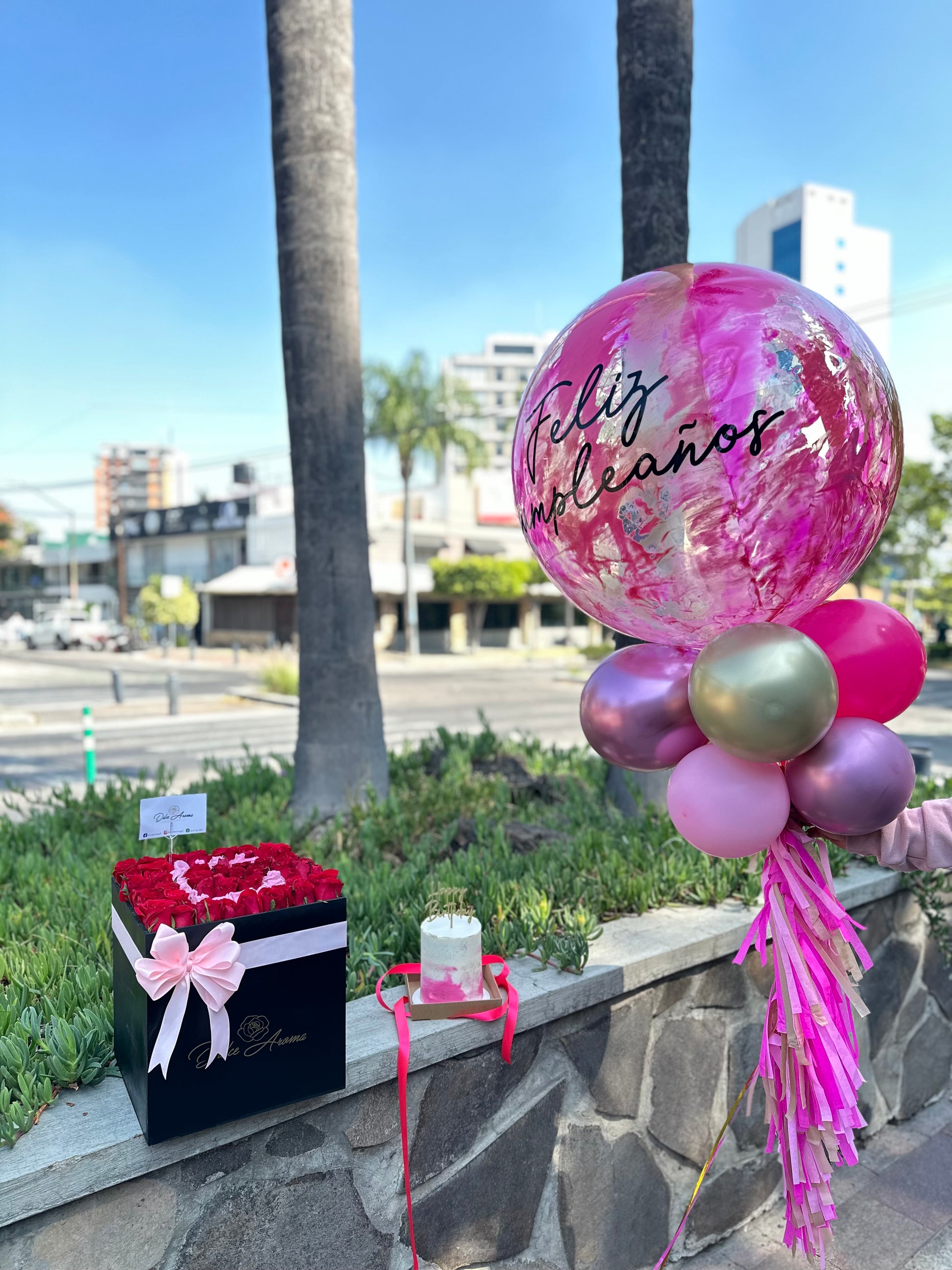 Globo gigante feliz cumpleaños, pastel de cumpleaños y caja negra en pave rosa roja y puede llevar letra personalizada (enviarlo por whats app)