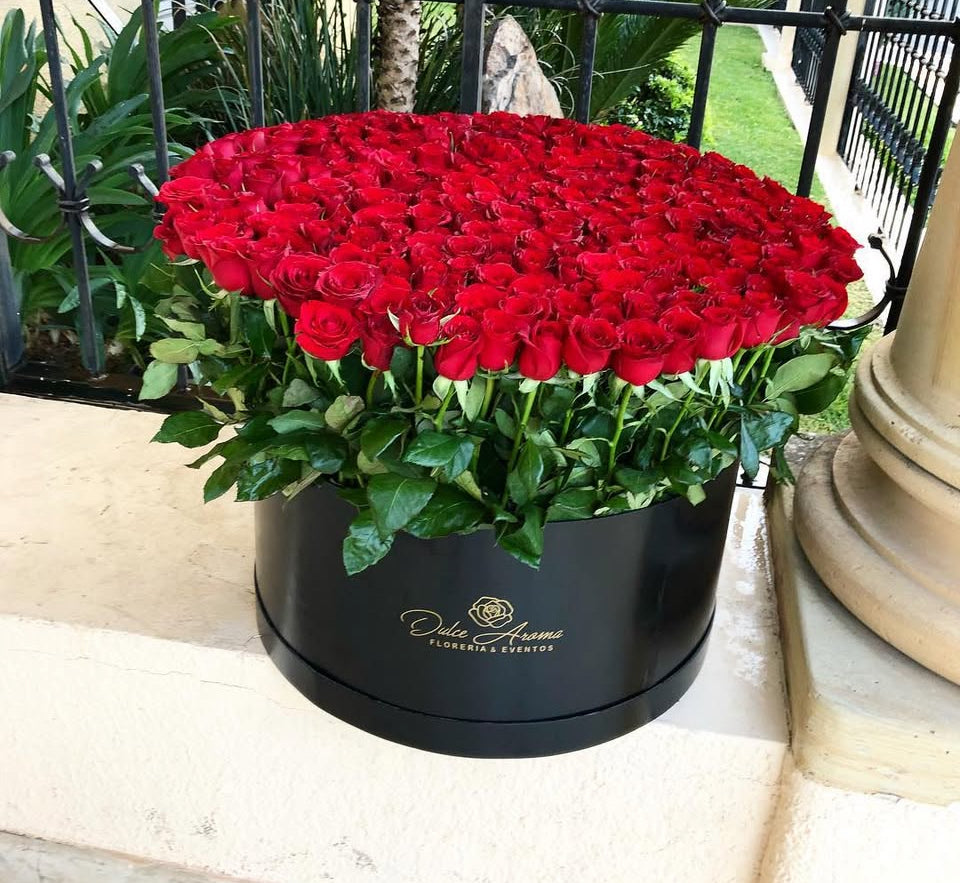 Caja circular 50 cm negra rosa roja alta aproximadamente 280 rosas