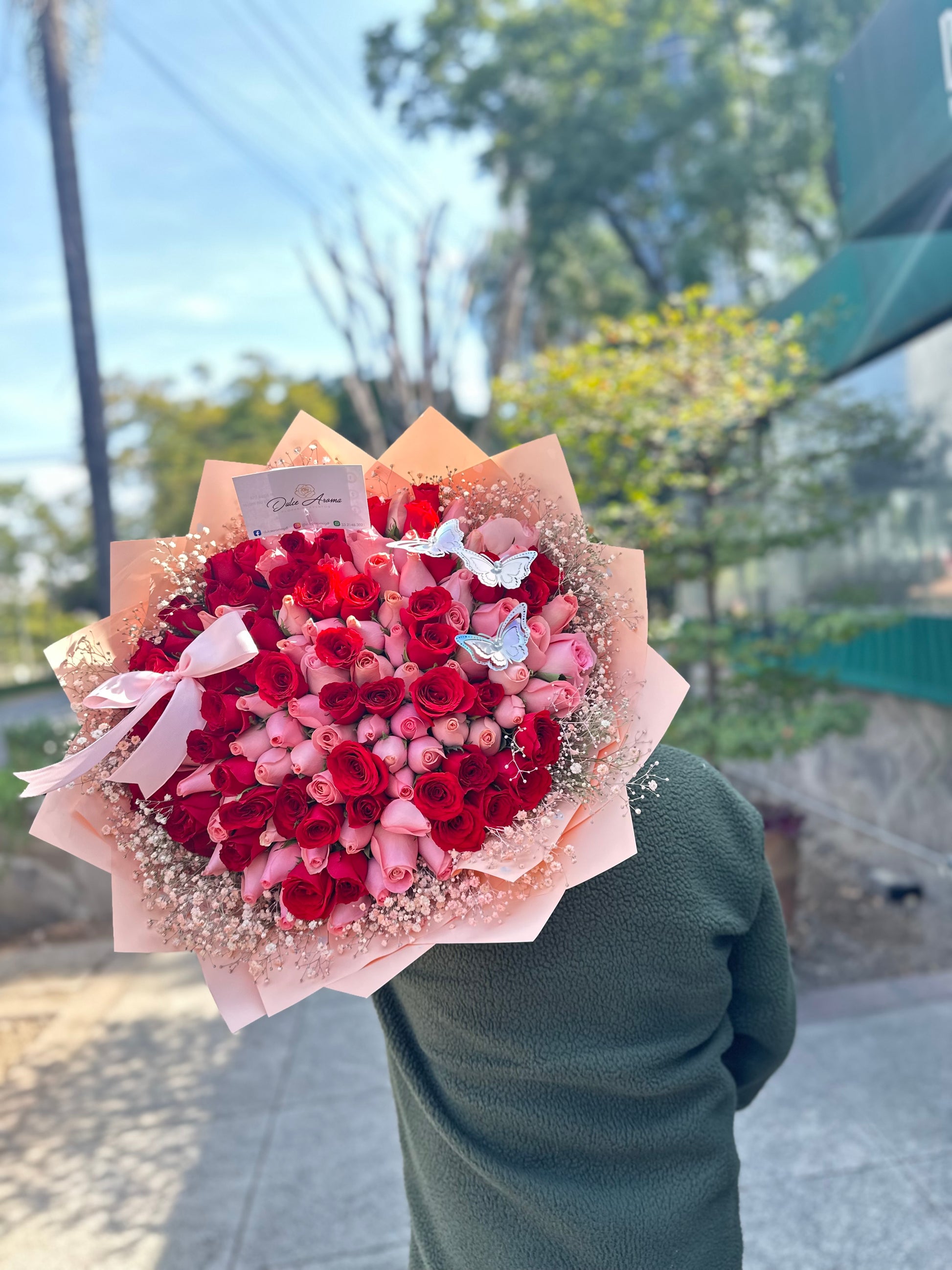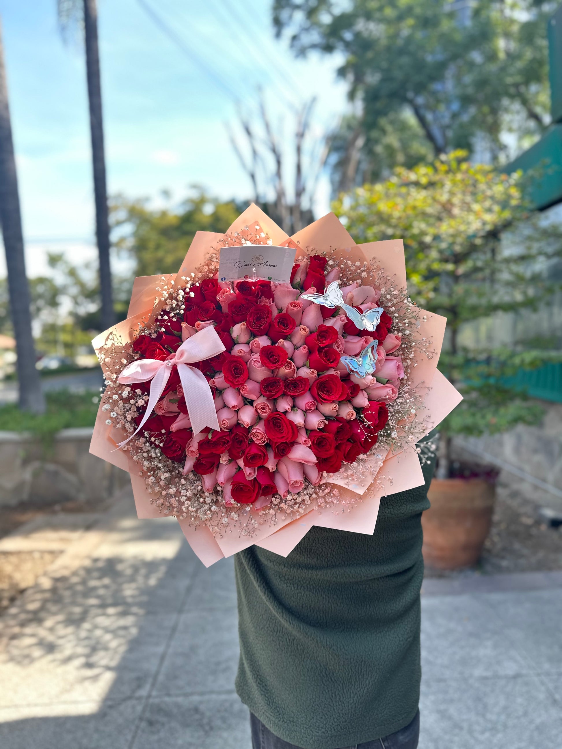 Ramo 100 rosas hermosa y roja al rededor gypso, moño sobre ramo y 3 mariposas