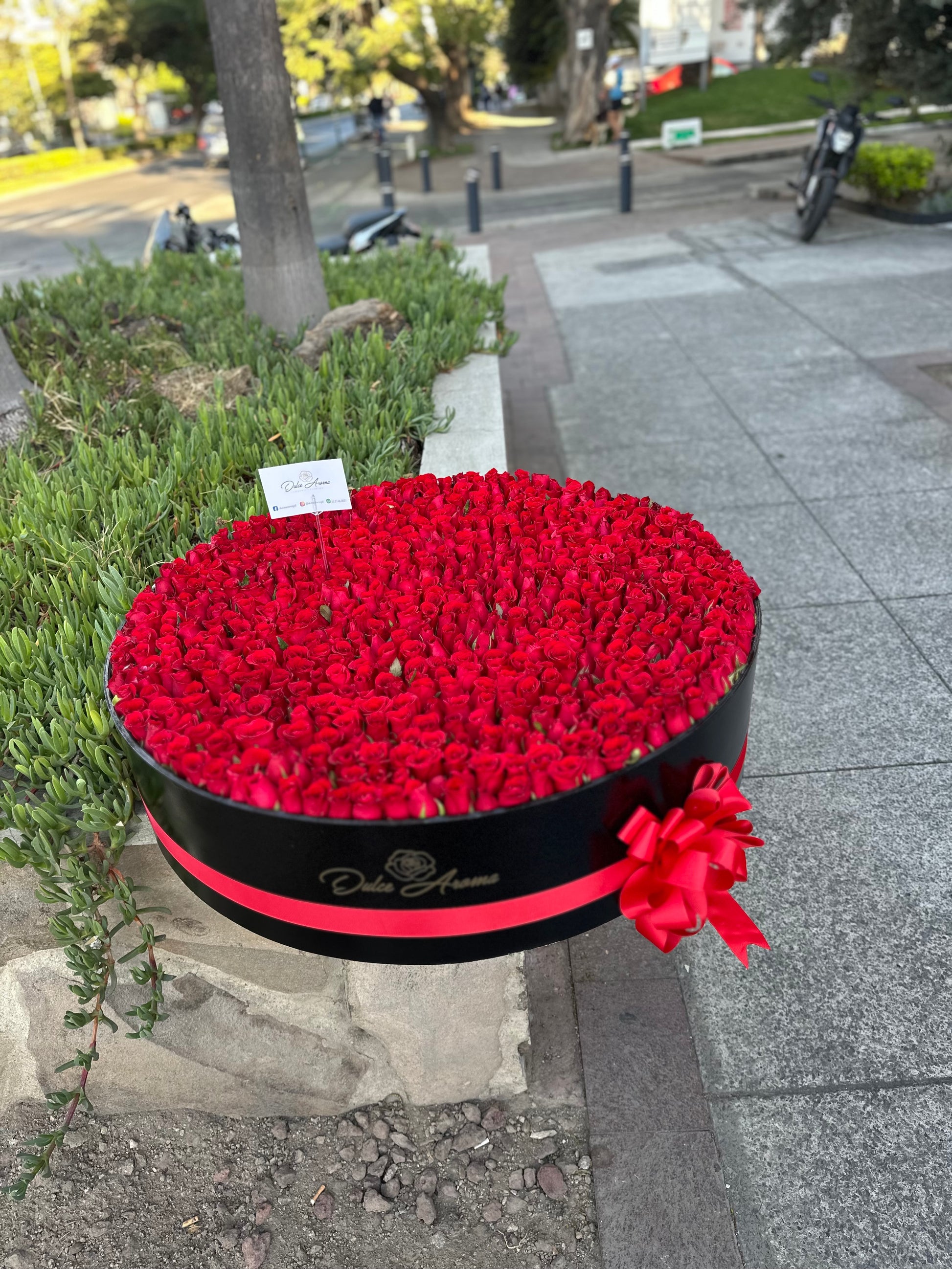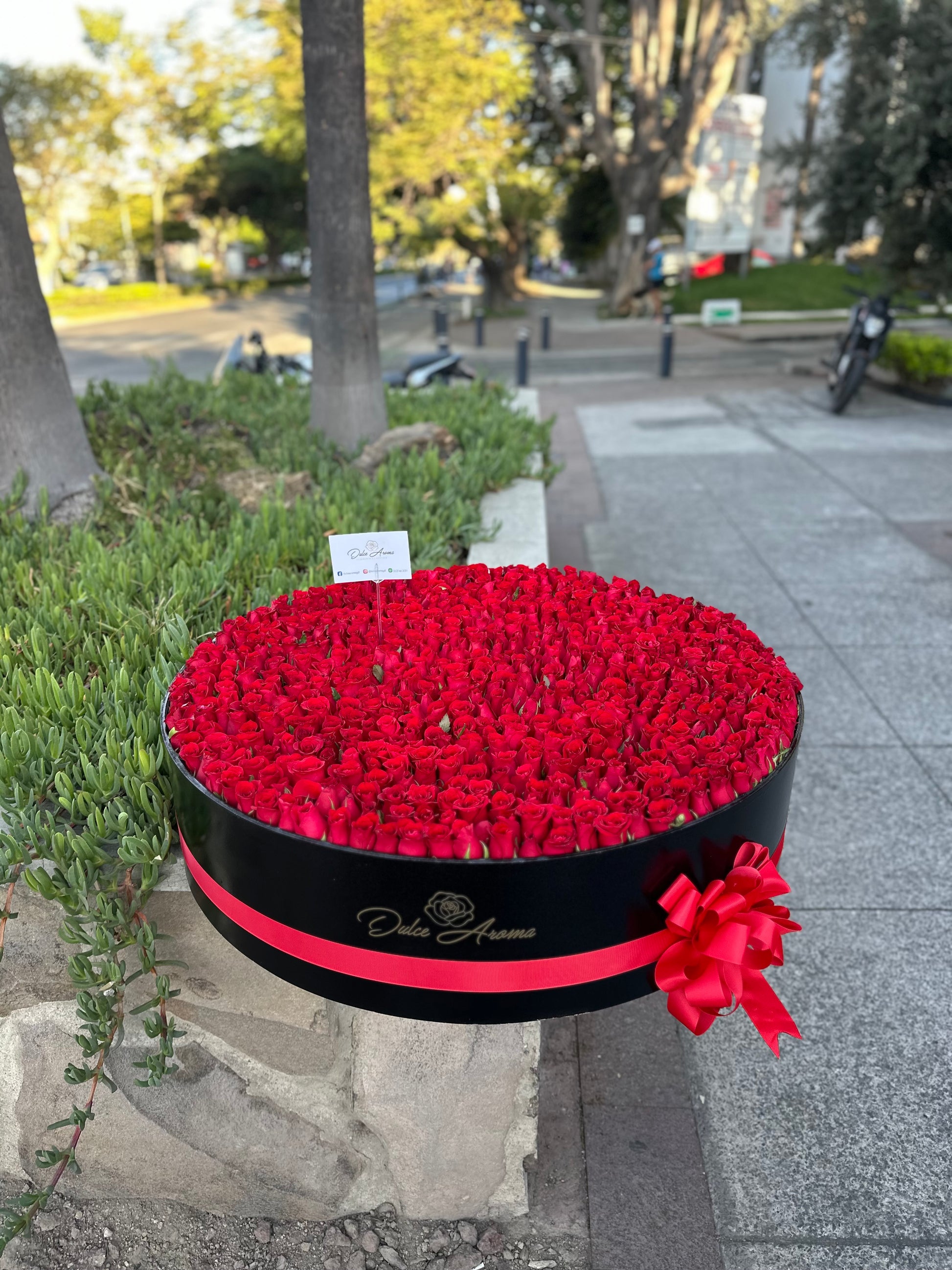 Caja circular Jumbo 80 cm base color negro con aproximadamente 500 rosas rojas