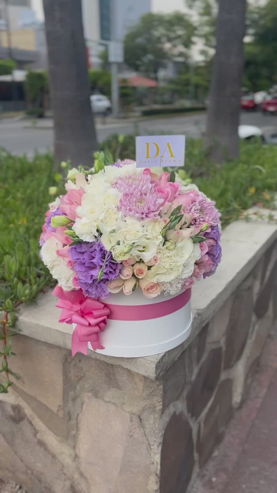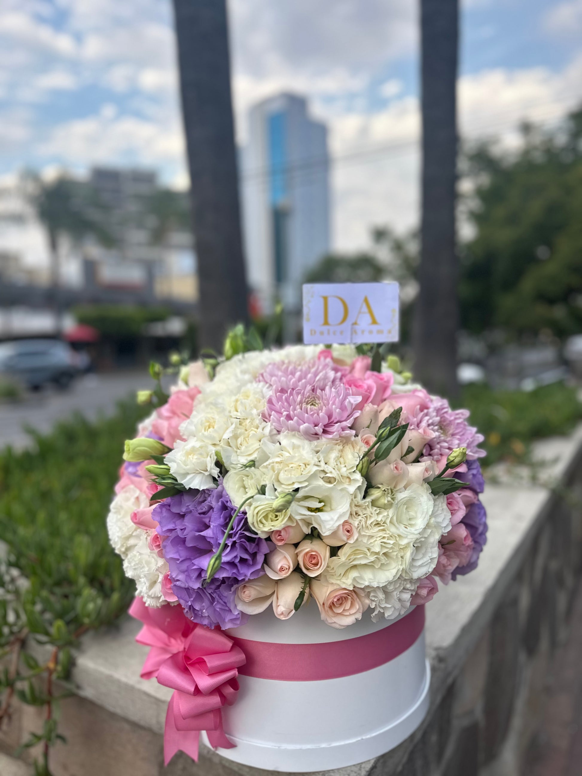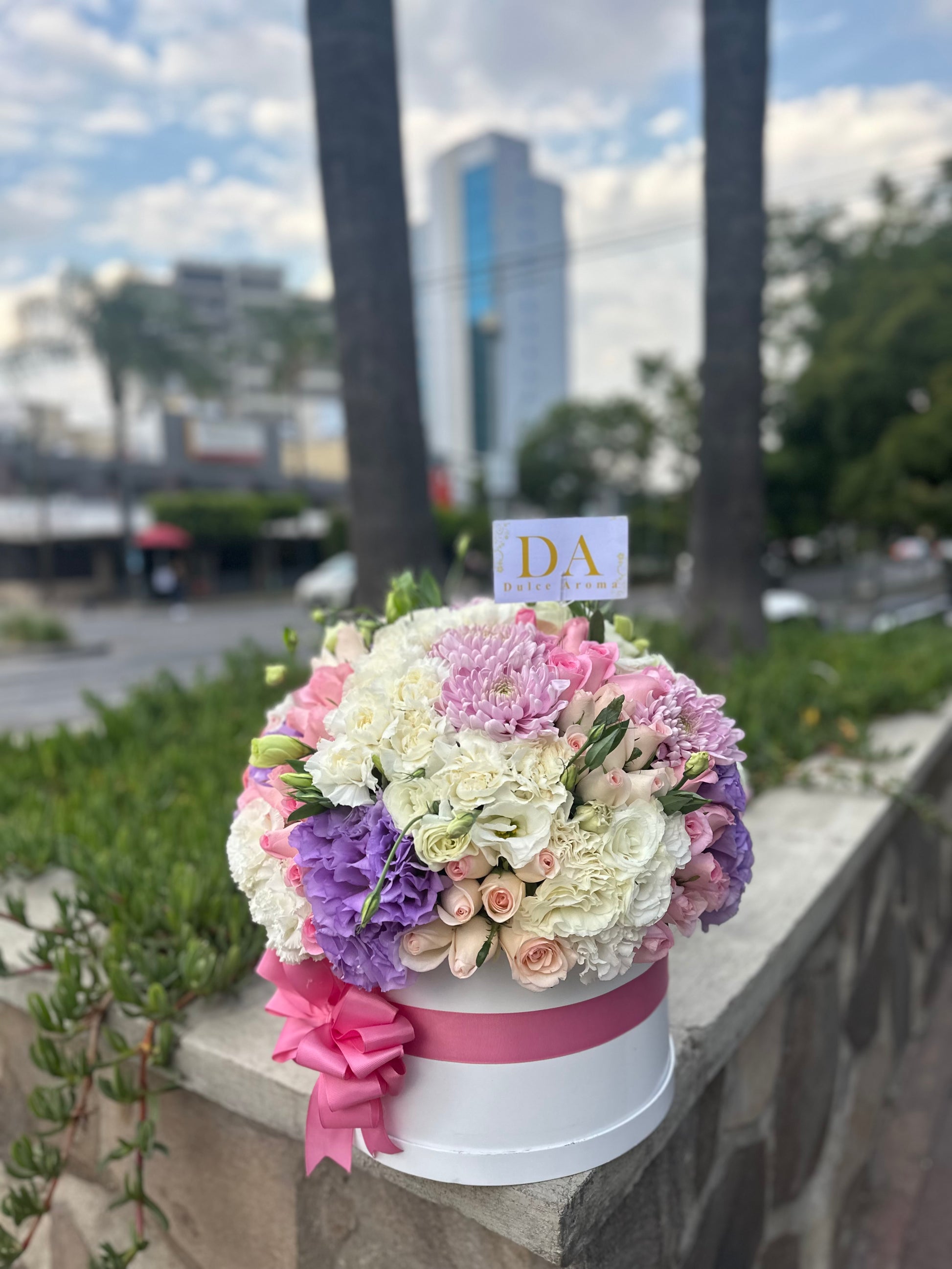 Caja circular 30 cm en base blanca con una esfera de variedad de flores como rosas, lisianthus, hortencias, claves y roxanas