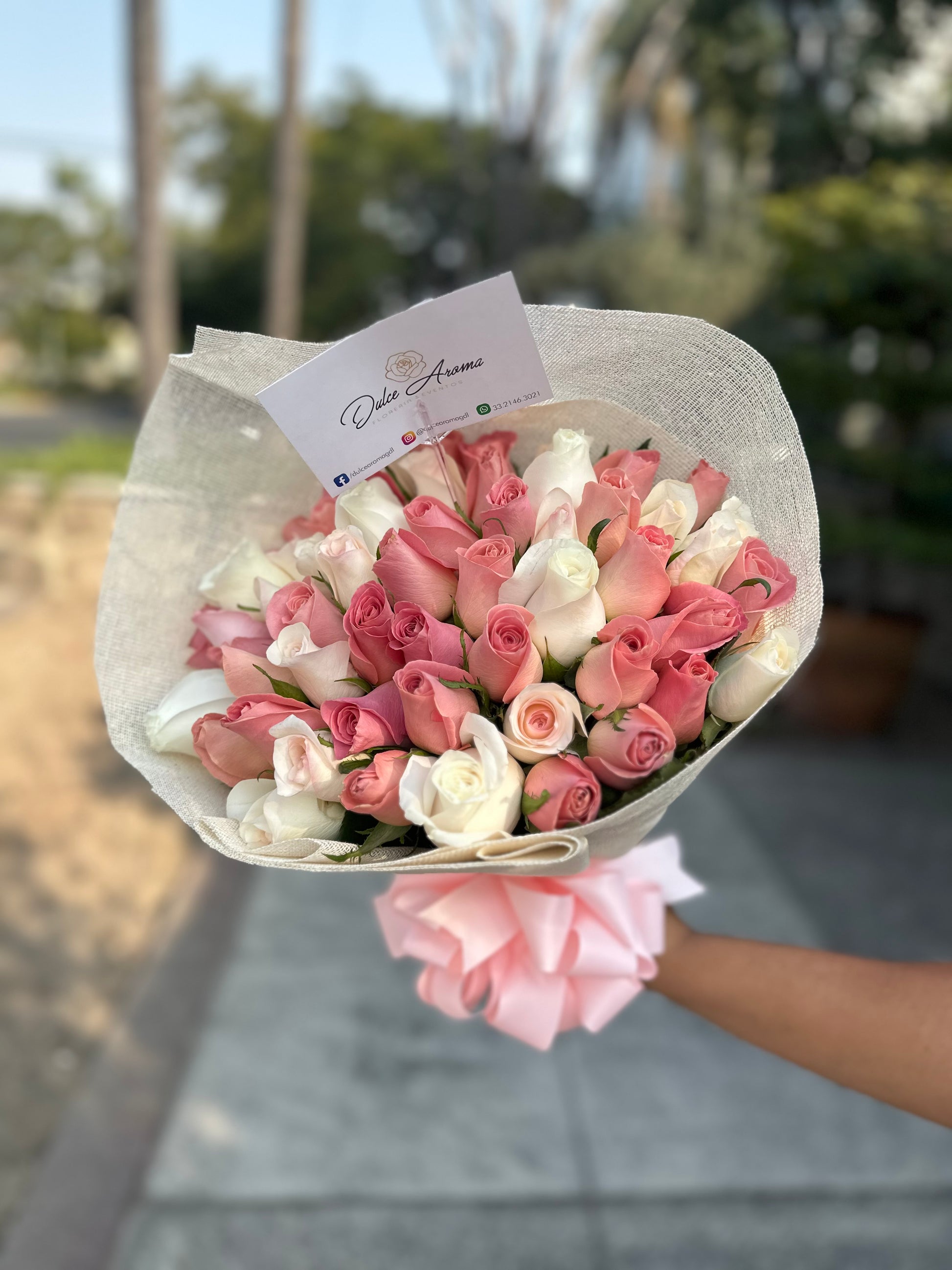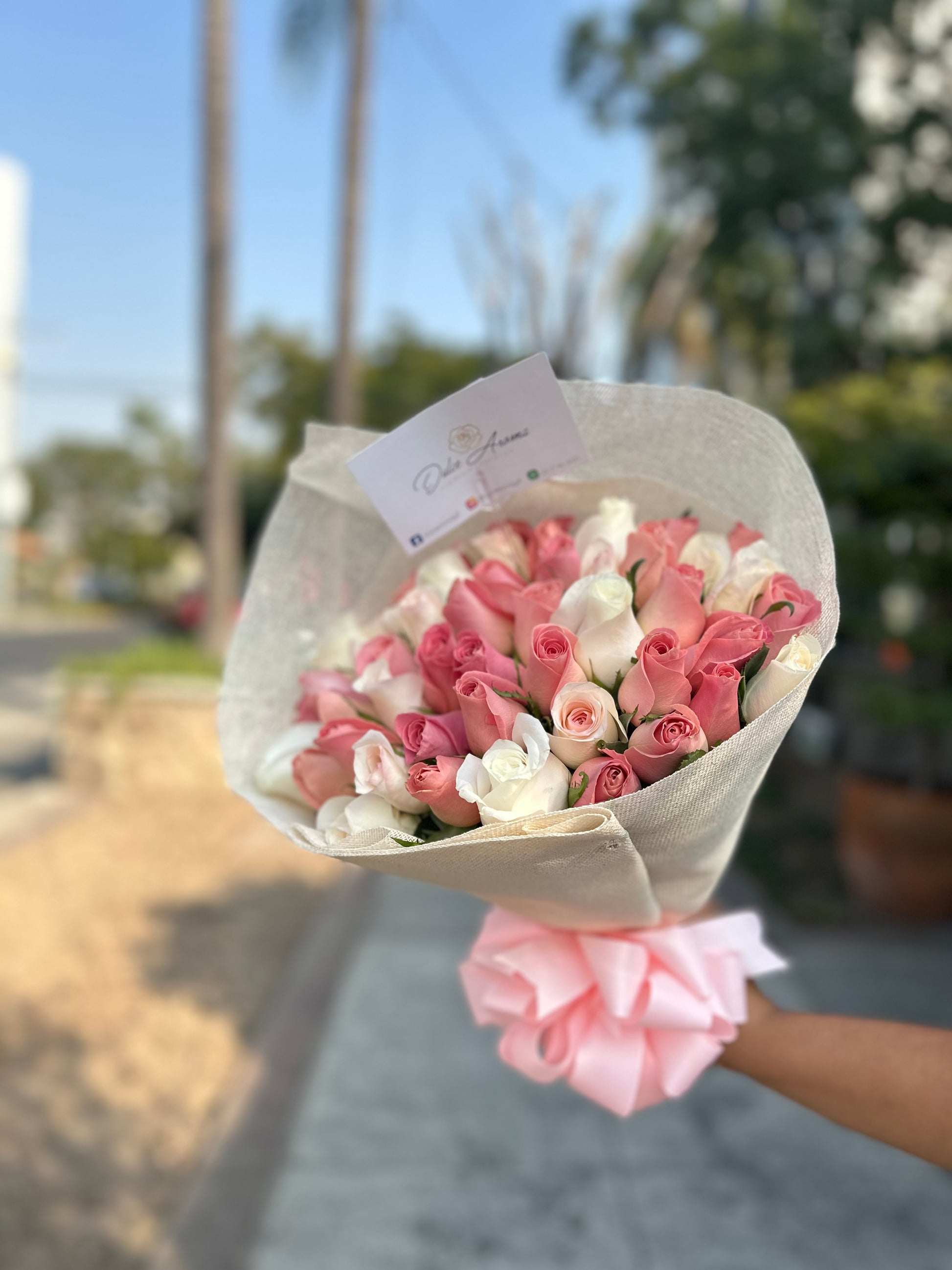 Ramo 50 rosas tonos hermosa y blanco envoltura yute