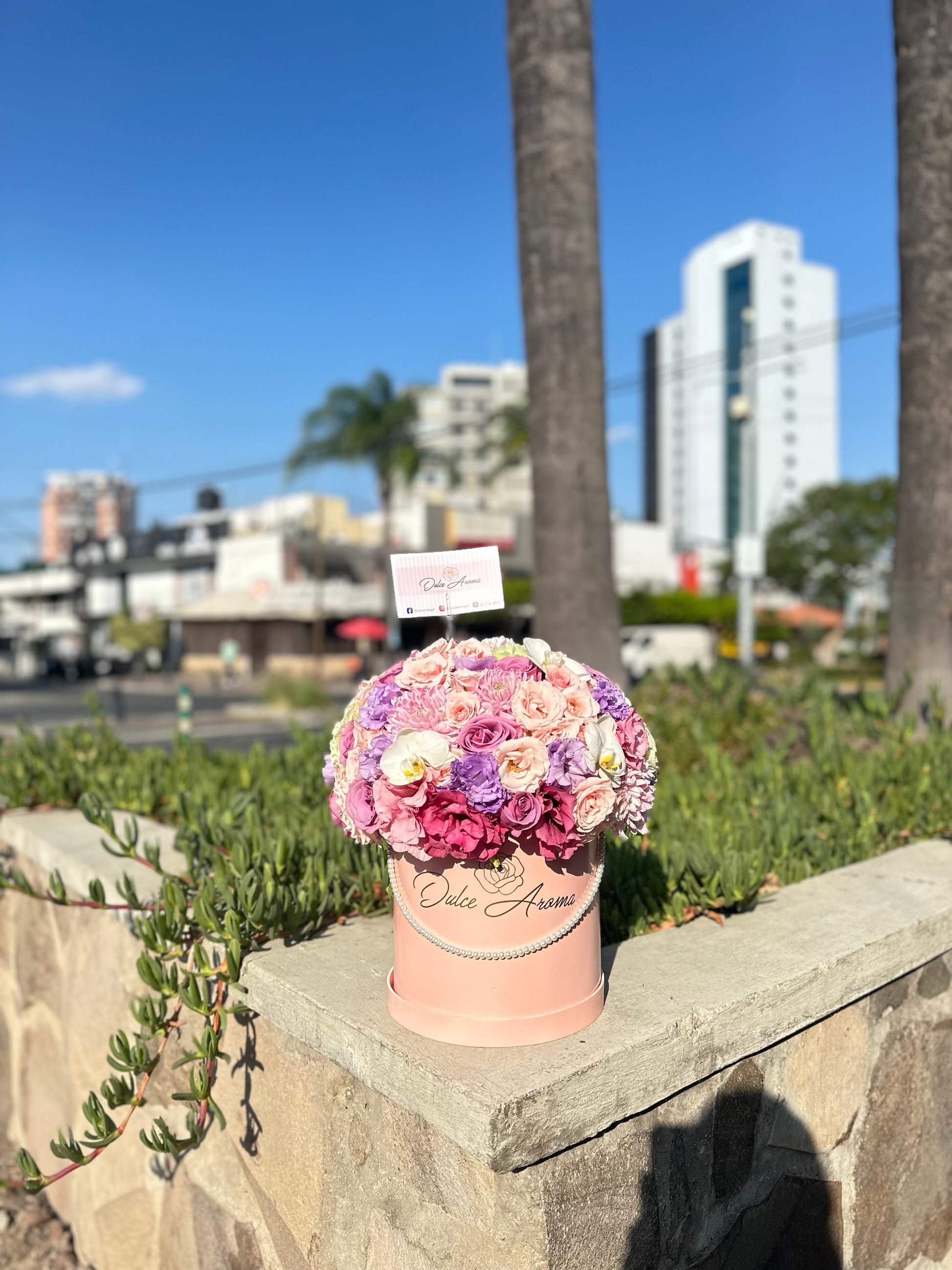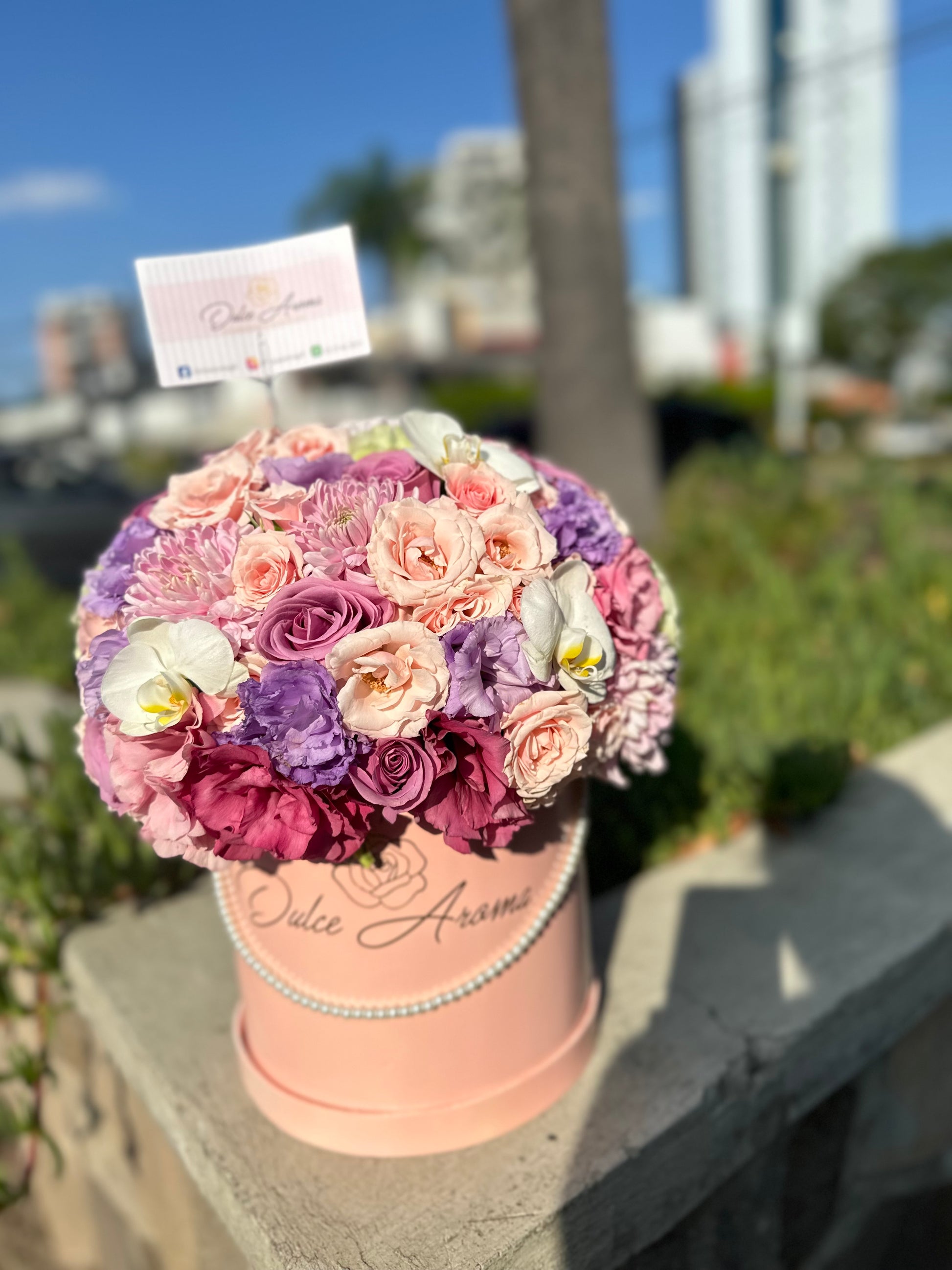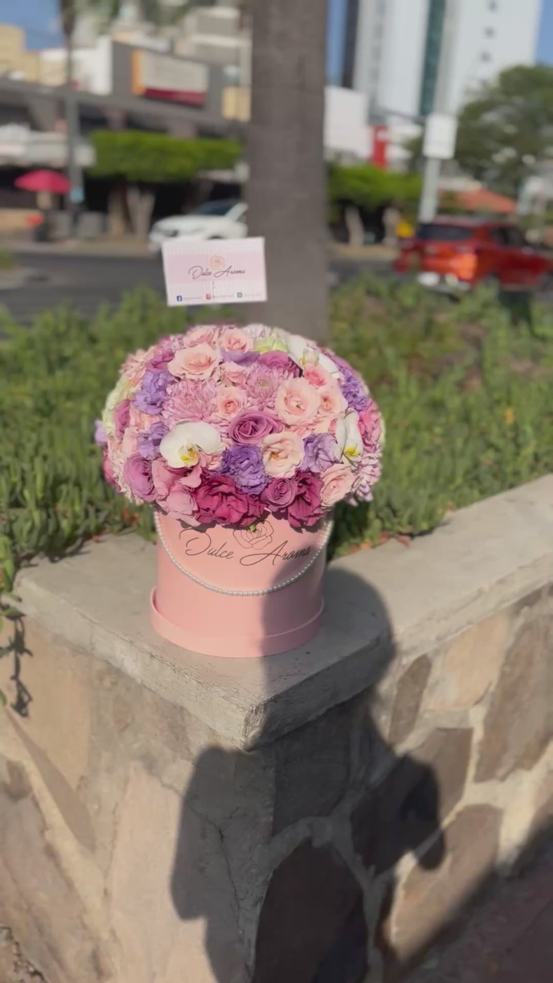 Cilindro chico, en esfera con rosas, roxanas, lisianthus, orquídeas ….