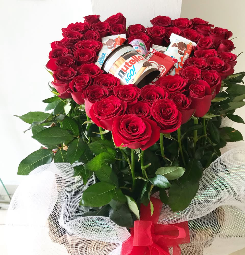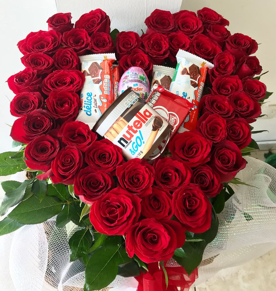 Canasta con rosas altas en jardín y en medio chocolates Kinder