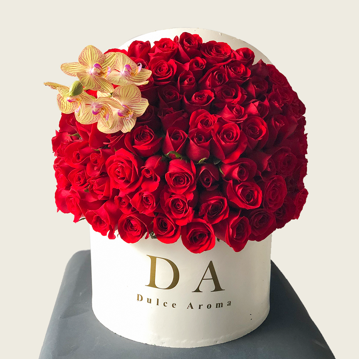 Circular 30 cm blanca con 100 a 150 rosas aproximadamente y orquídeas