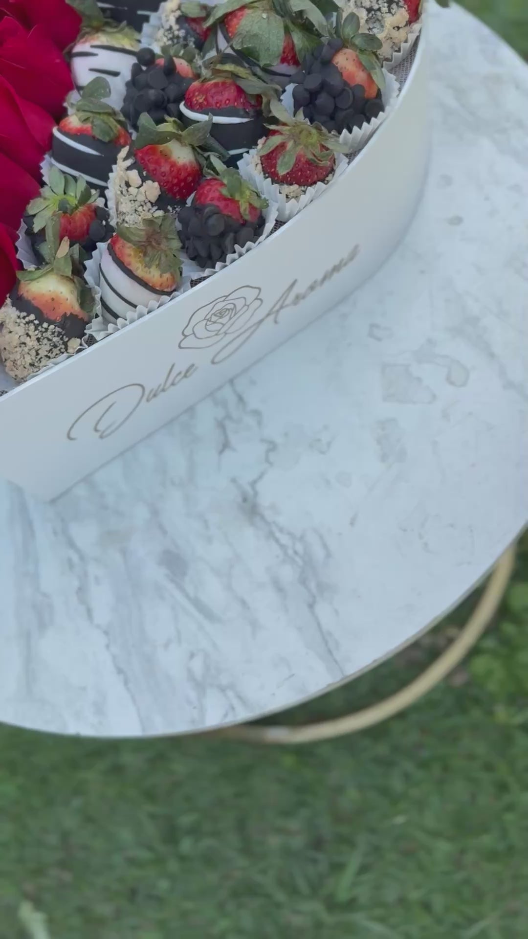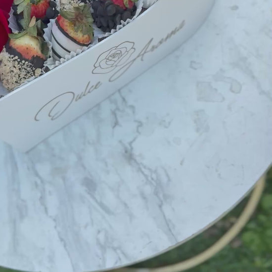 Corazón chico blanco, mitad rosa roja, mitad fresas