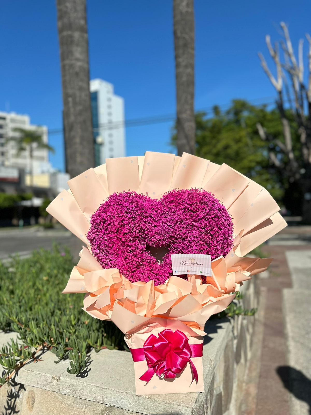Diseño floral en forma de corazón en caja con gipsófilas rosa