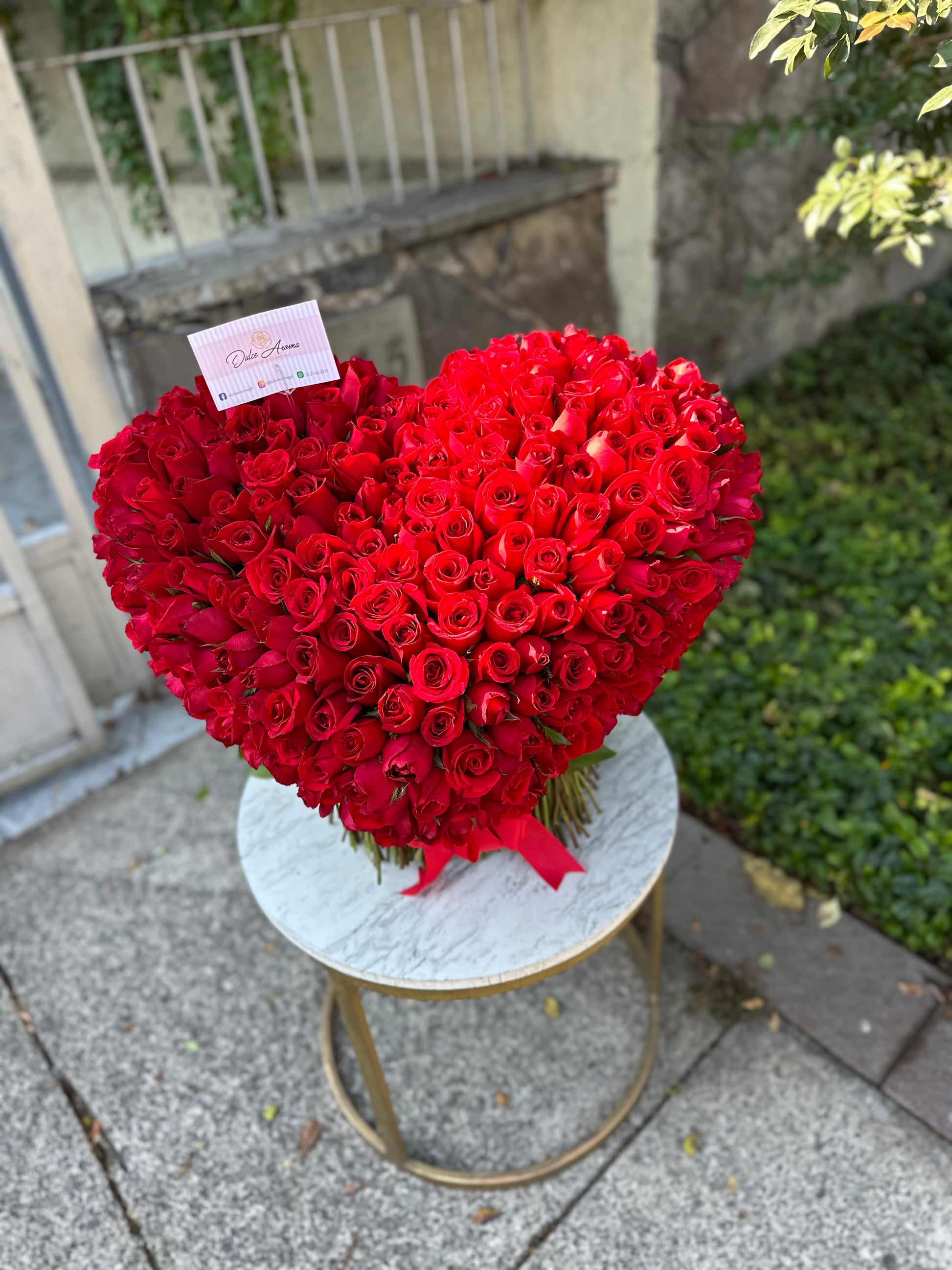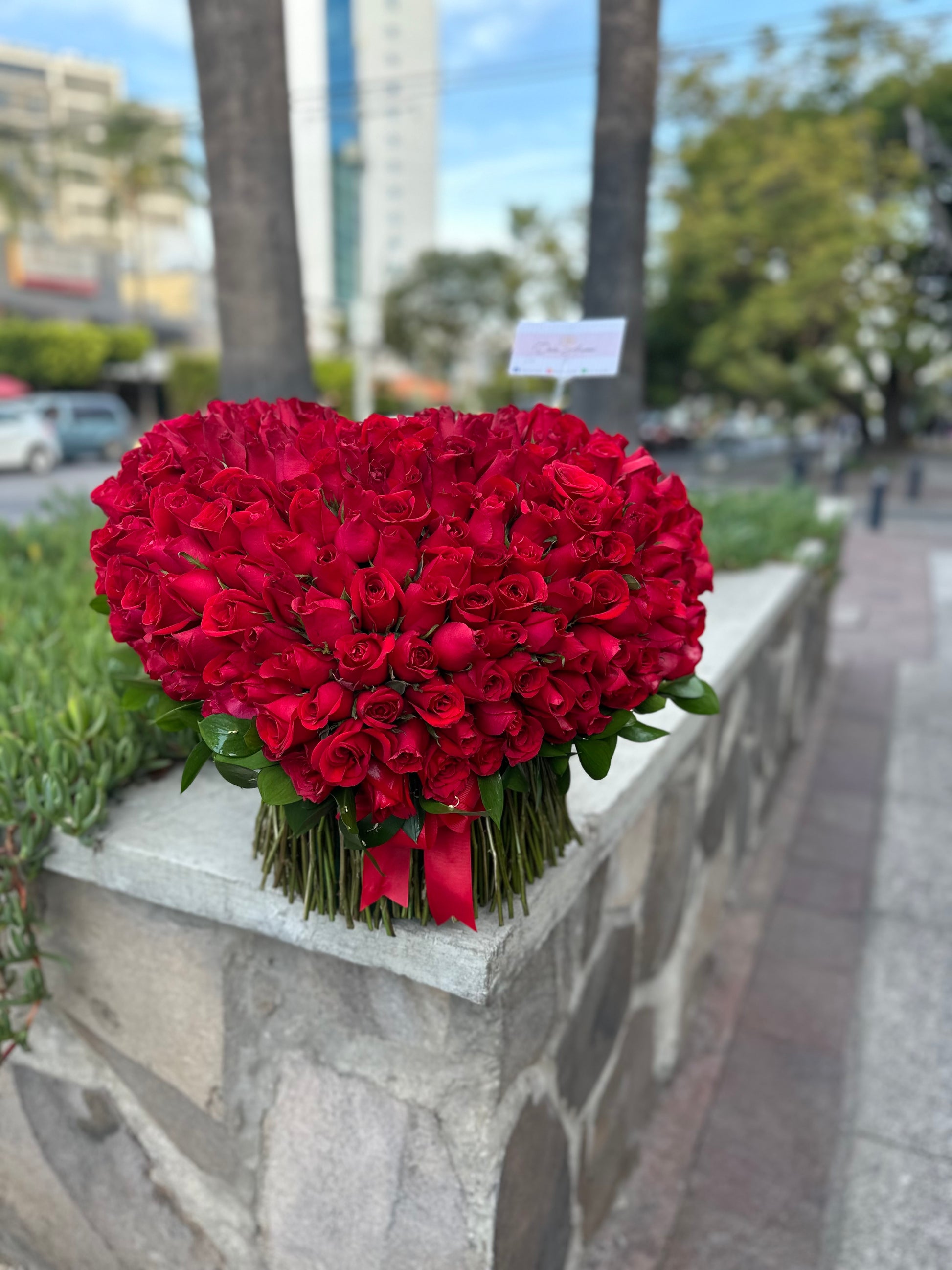 Diseño en estructura en forma de ramo con aproximadamente 250 rosas rojas