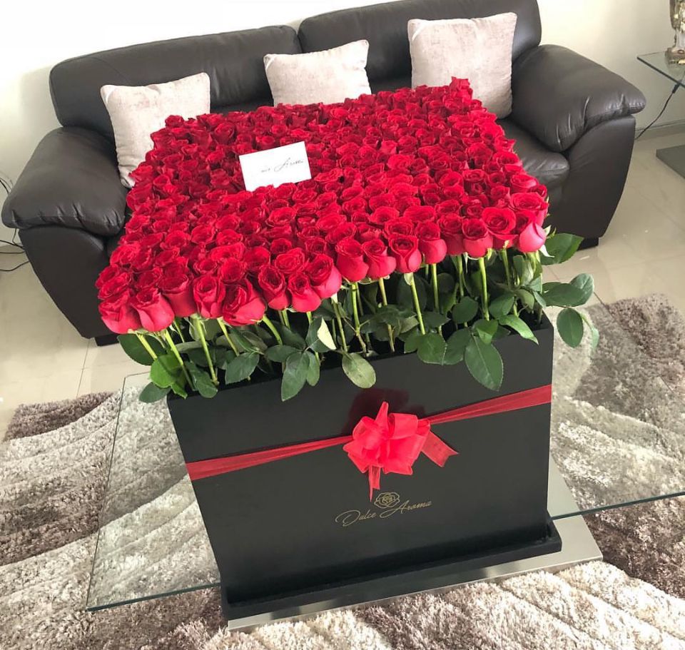 Caja cuadrada negra, gigante, 400 rosas rojas altas aproximadamente