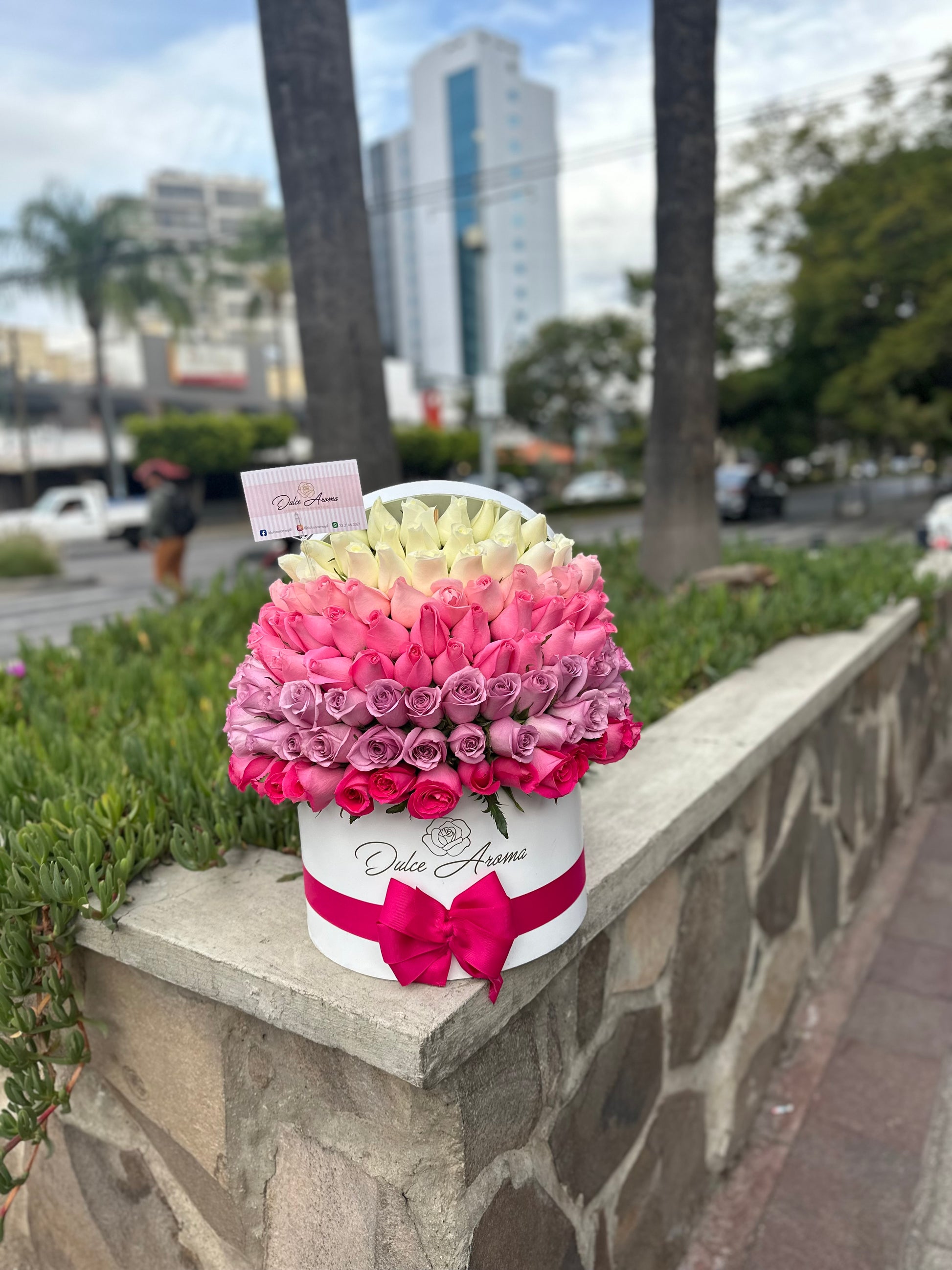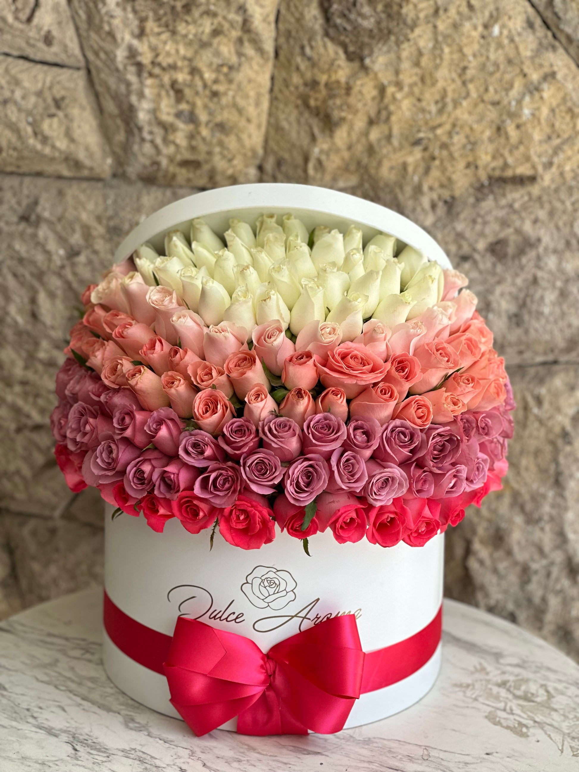Caja circular blanca 30 cm, media esfera con aproximadamente 150 rosas en degradación