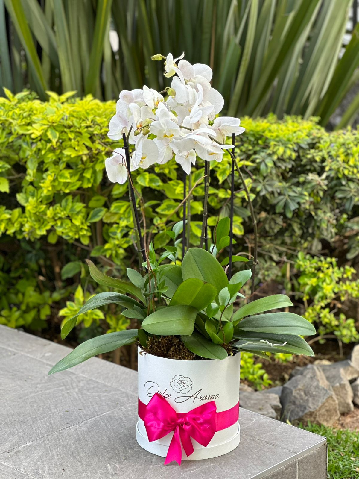 Cilindro 20 cm blanco, con dos macetas de orquídea con raíz para trasplantar