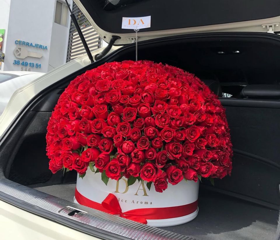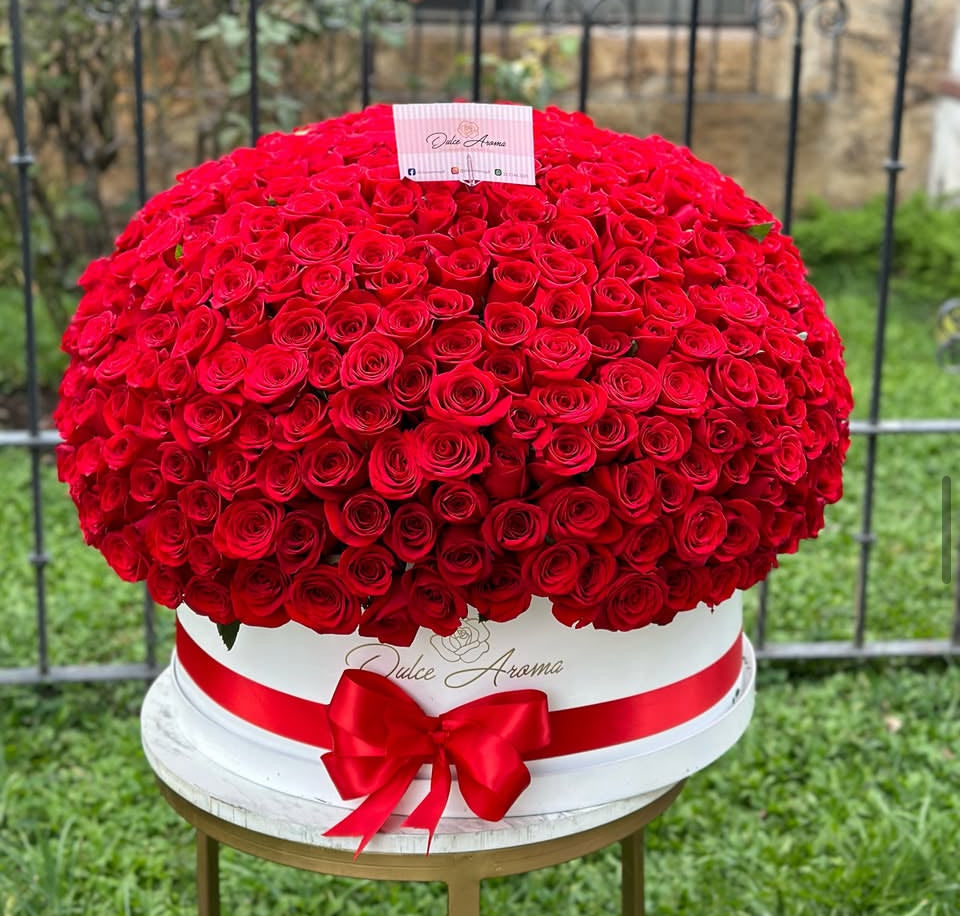 Caja circular blanca 50 cm media esfera de 500 rosas rojas