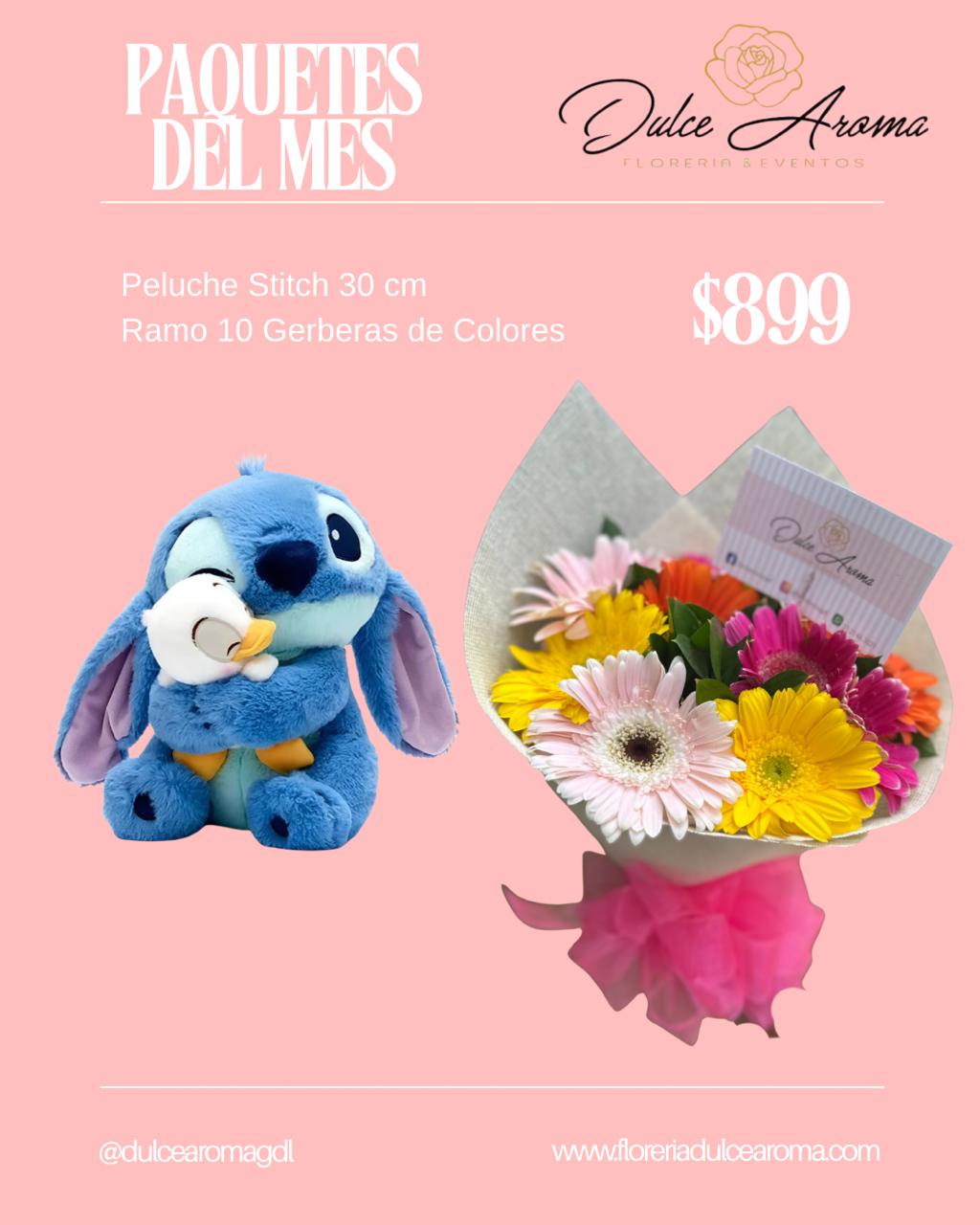 Peluche stitch 30 cm y 10 gerberas de varios colores