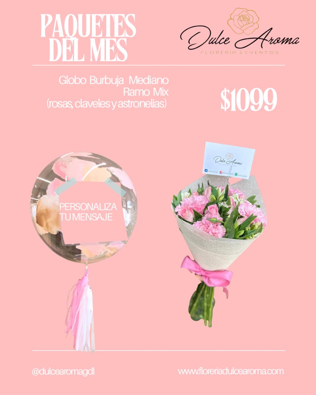 Globo mediano burbuja, enviar el mensaje por WhatsApp y ramo mix