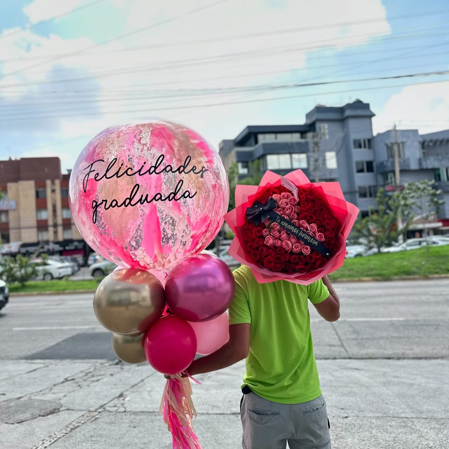 Ramo 100 rosas con corazón rojo y rosas hermosas al rededor y globo gigante