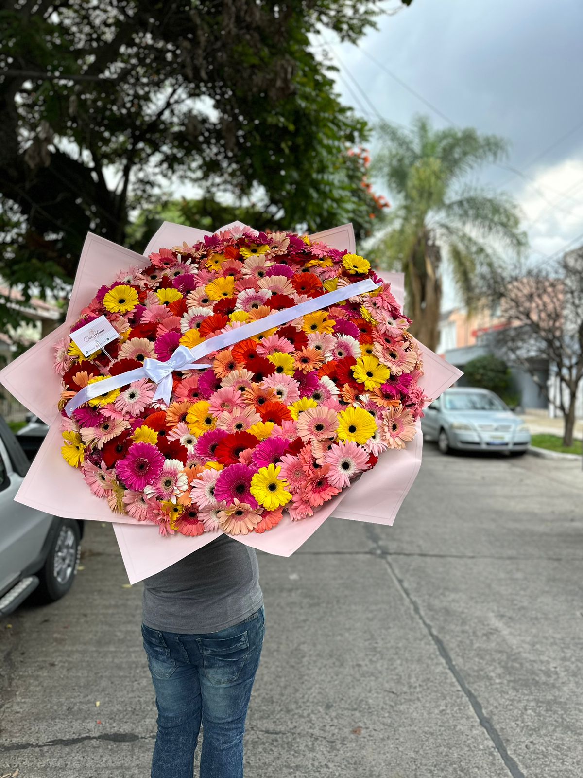 Ramo 100 gerberas de colores, envoltura rosa y listón con moño