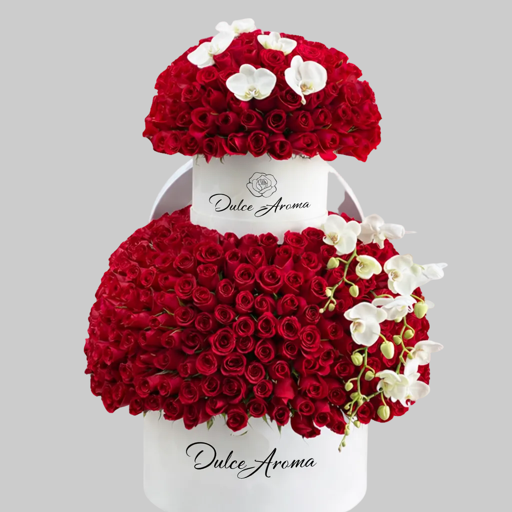 Caja Circular 60 cm blanca media esfera y sobre ella una caja 30 cm blanca con una esfera de rosas y orquídeas