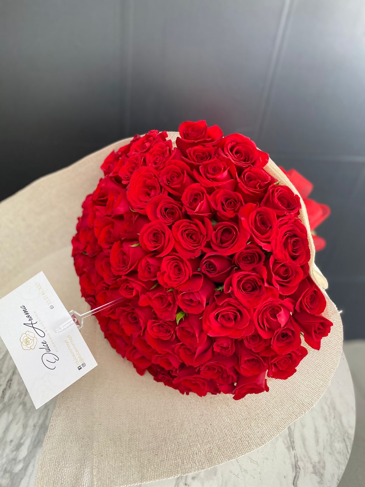 Ramo 100 rosas envoltura yute. (Si requiere otro color de envoltura favor de contactarnos)