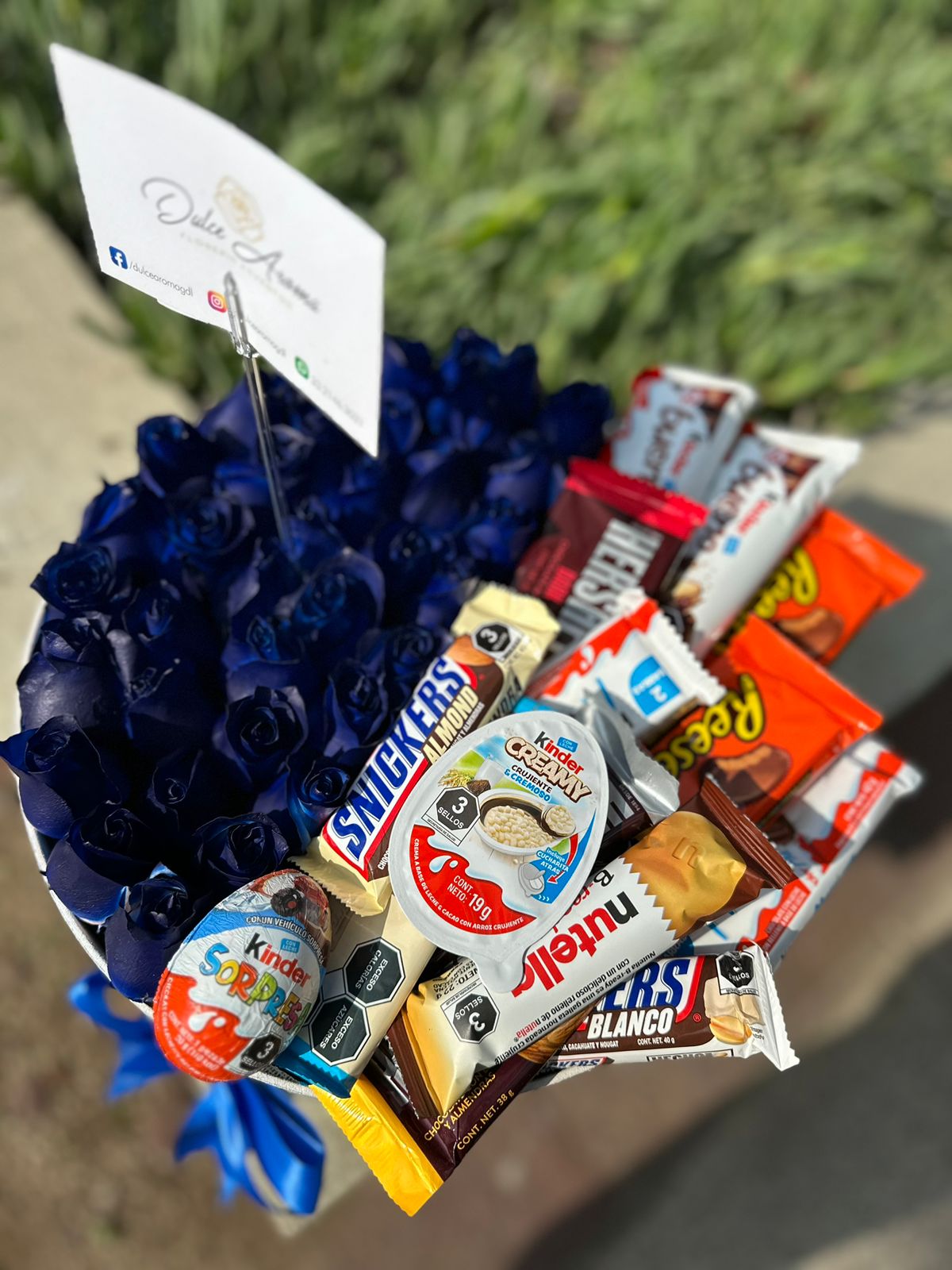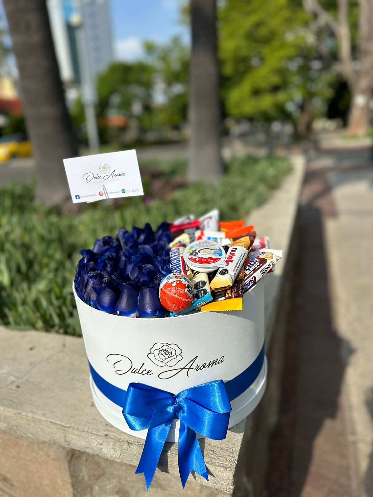 Caja circular 30 cm, blanca, mitad rosa azul, mitad chocolates variados