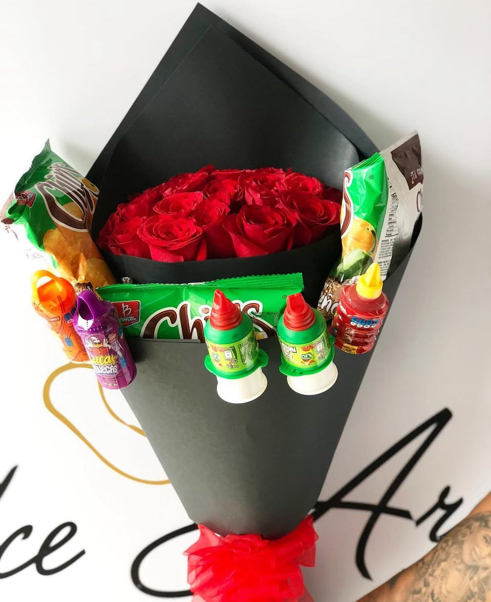 Ramo 24 rosas rojas con variedad de dulces (si tiene algún dulce en especial favor de escribirnos)