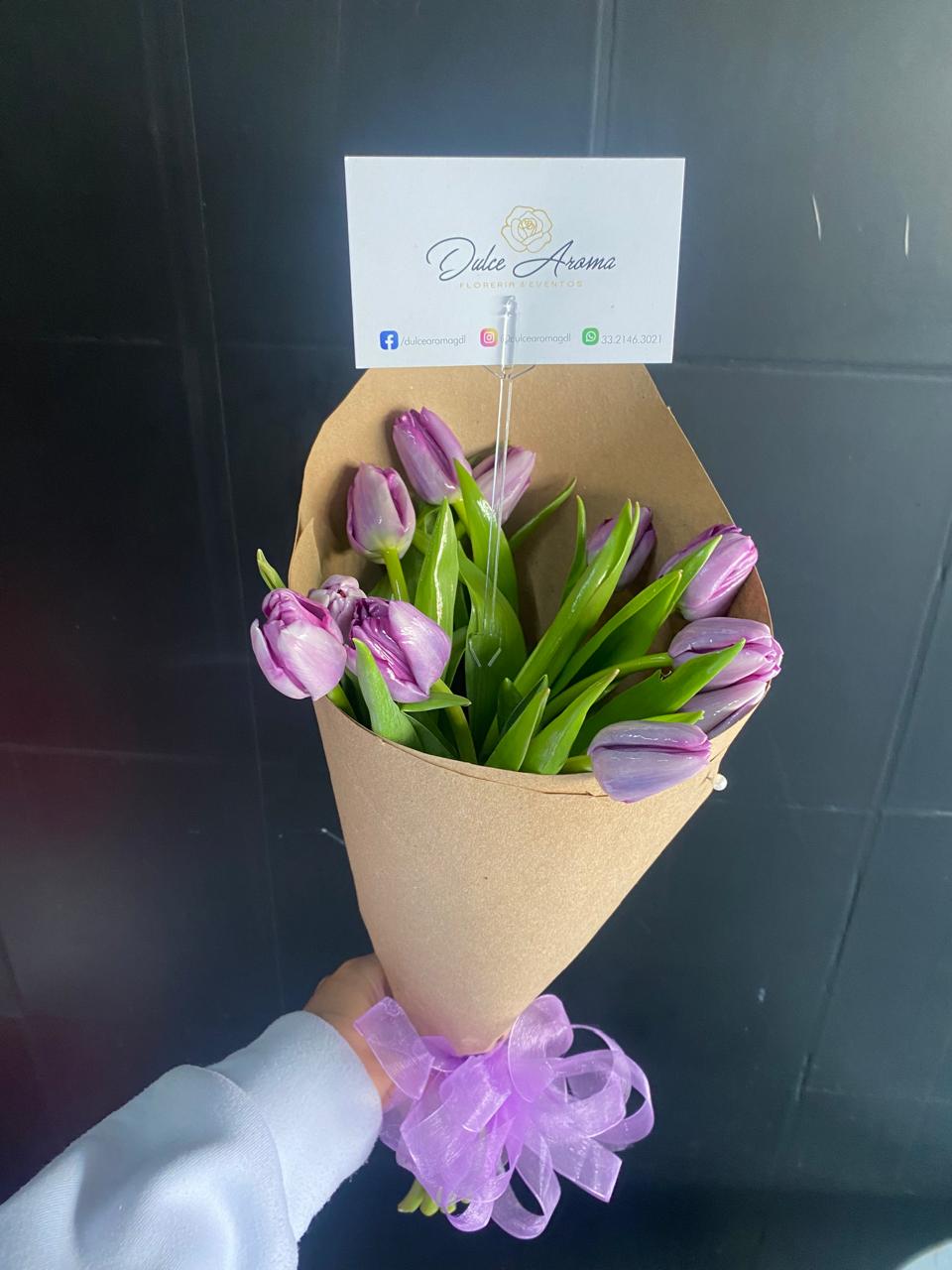 Ramo 10 tulipanes morados, envoltura papel Kraft, en caso de querer otro tono de tulipanes favor de enviar whats app para los colores disponibles