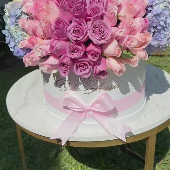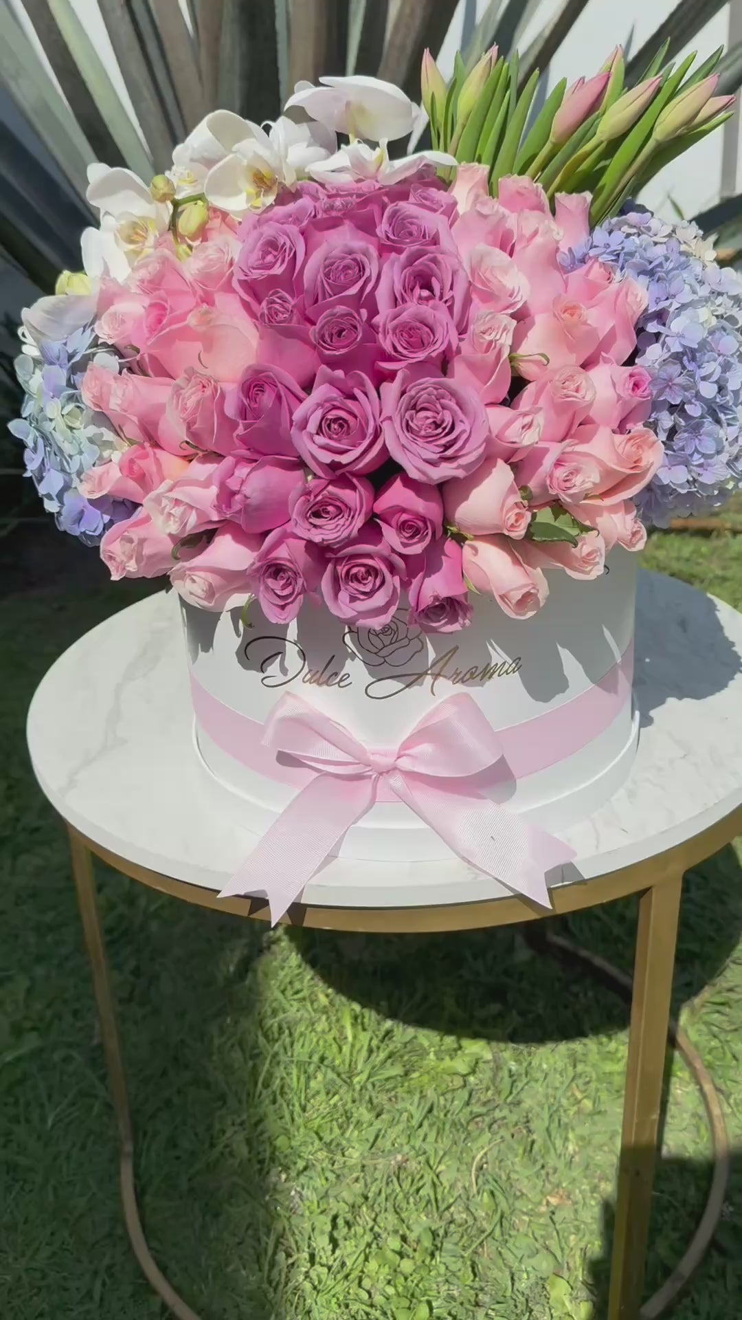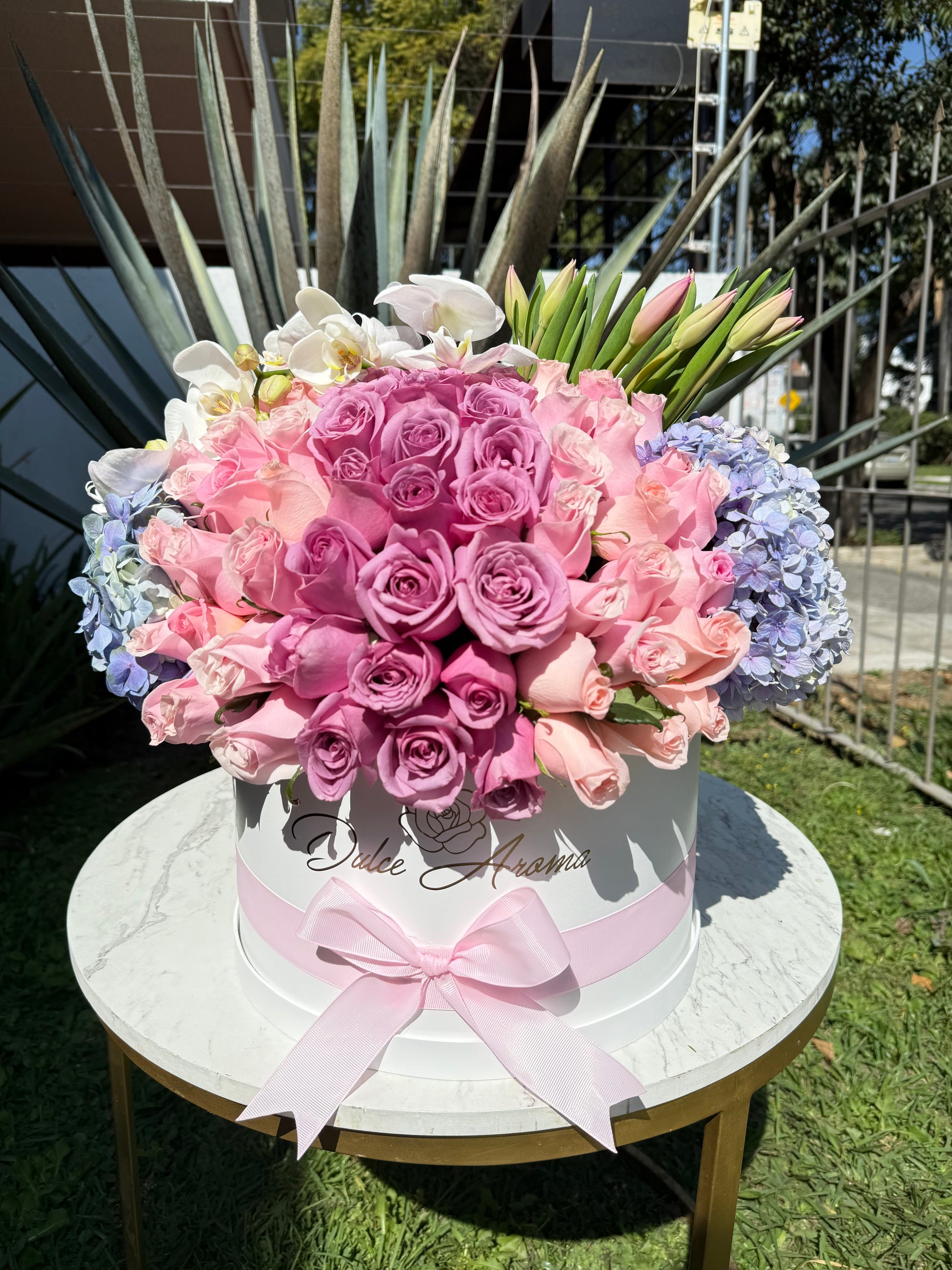 Circular esfera 30 cm blanca con rosas, hortencias, orquídeas y tulipanes