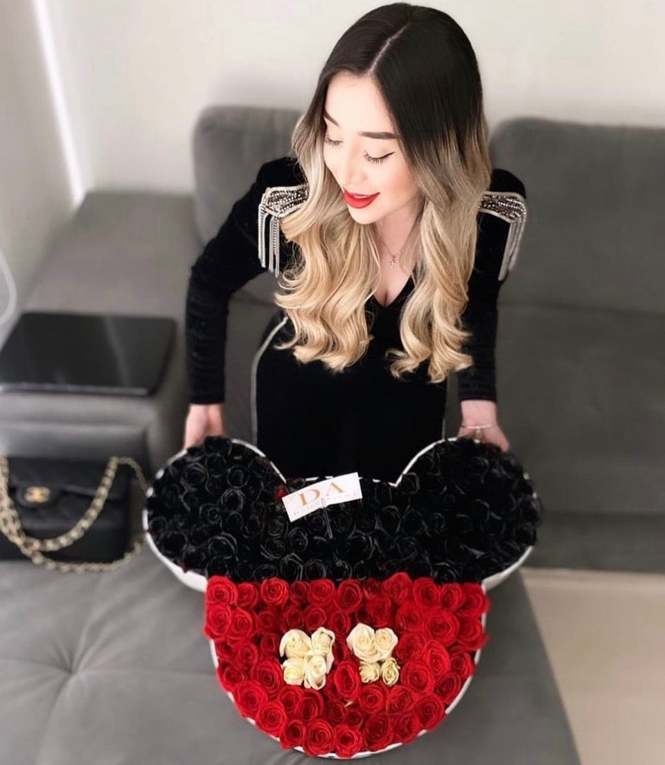 Caja Mickey chica rosas en forma de traje de Mickey