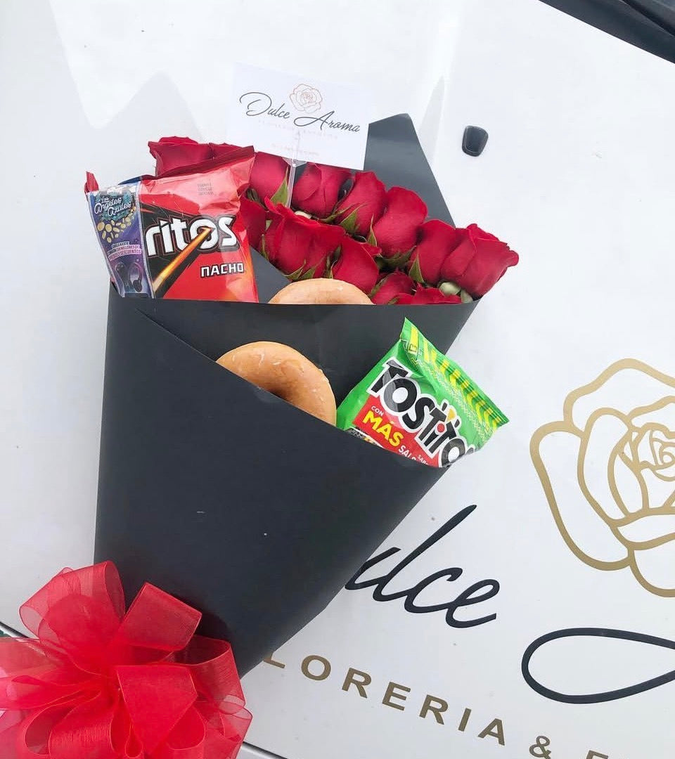 Ramo 12 rosas con 2 paquetes de papas a tu elección y 2 donas glaseadas