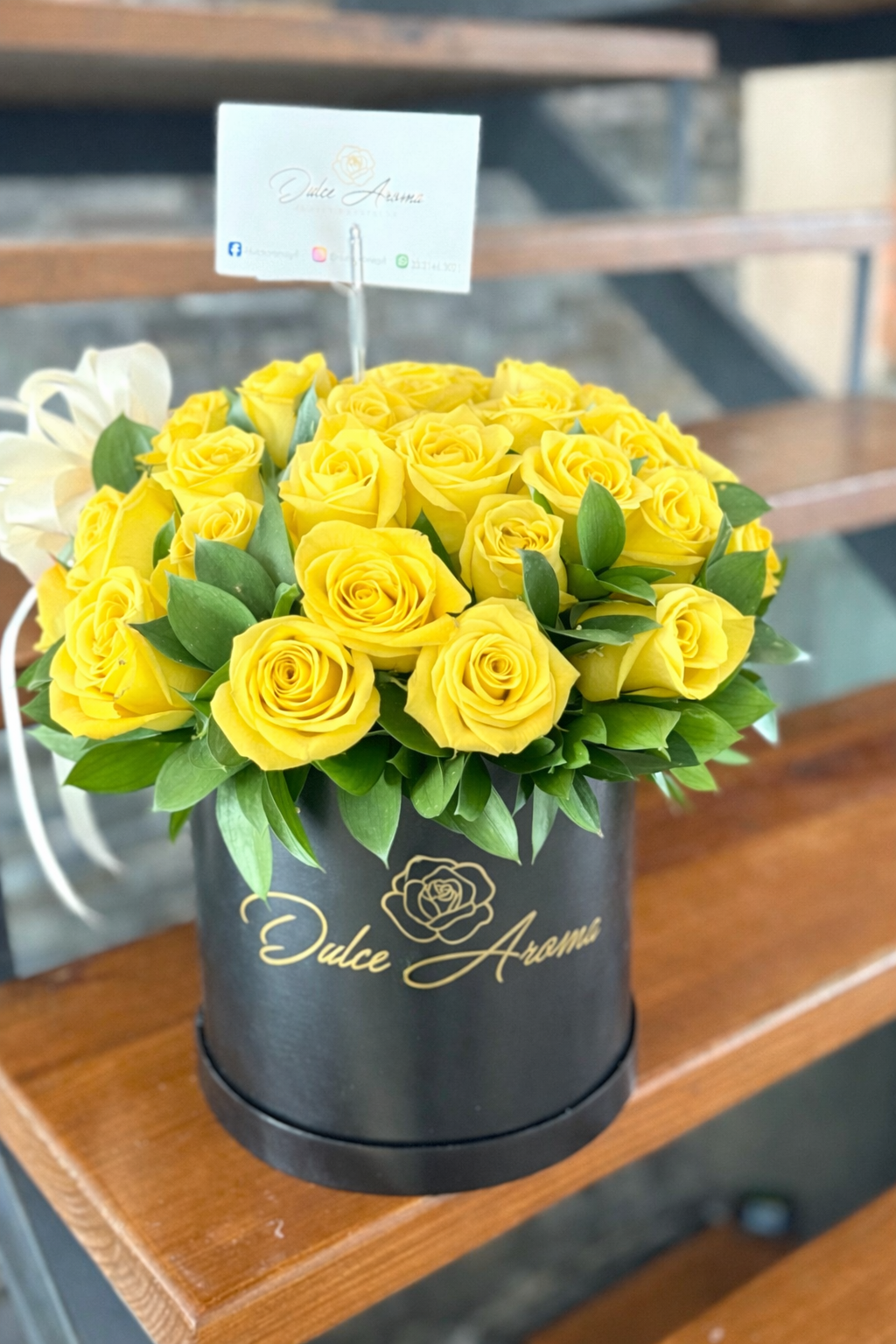 Caja circular chica 20 cm, con una esfera de aproximadamente 50 rosas amarillas y follaje,