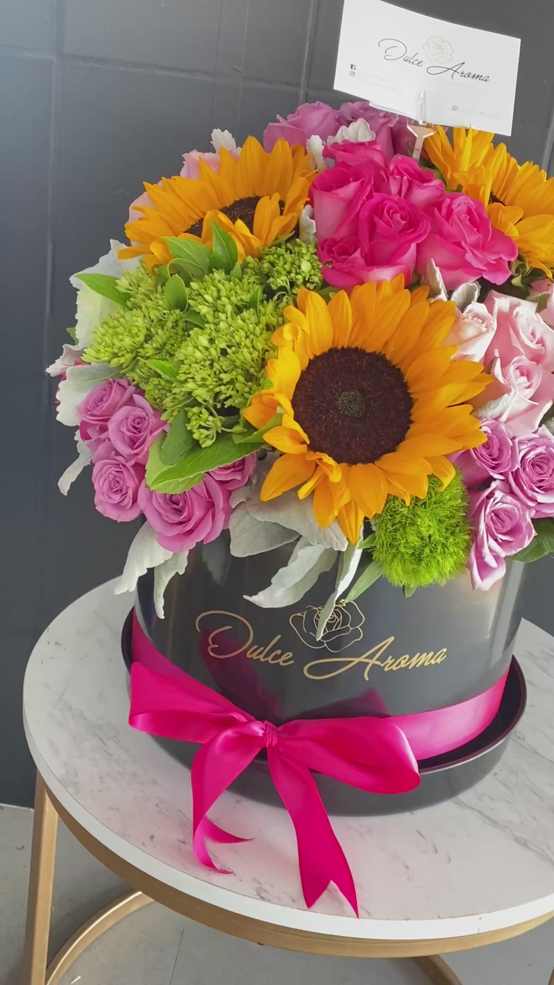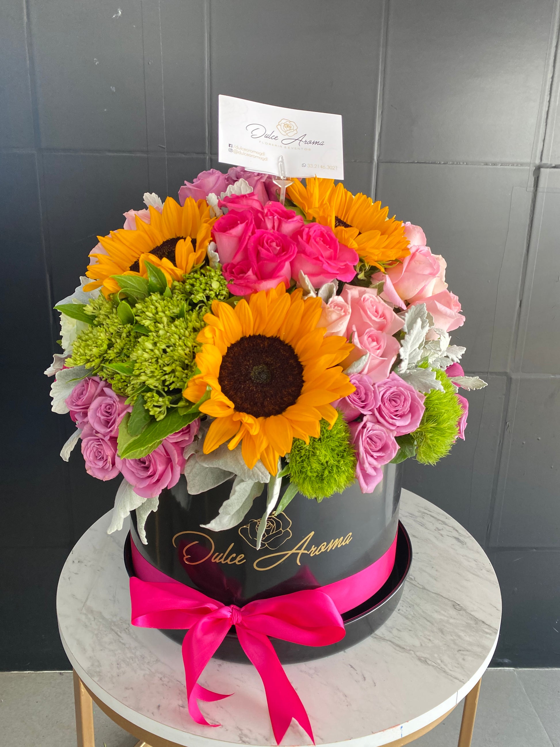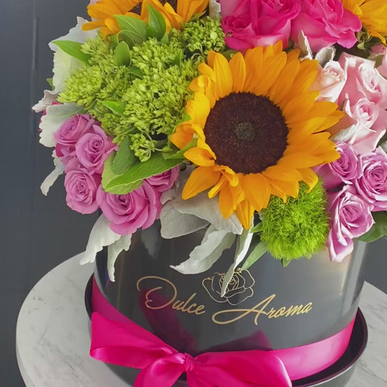 Caja circular 30 cm negra, rosas, girasoles y hortensias
