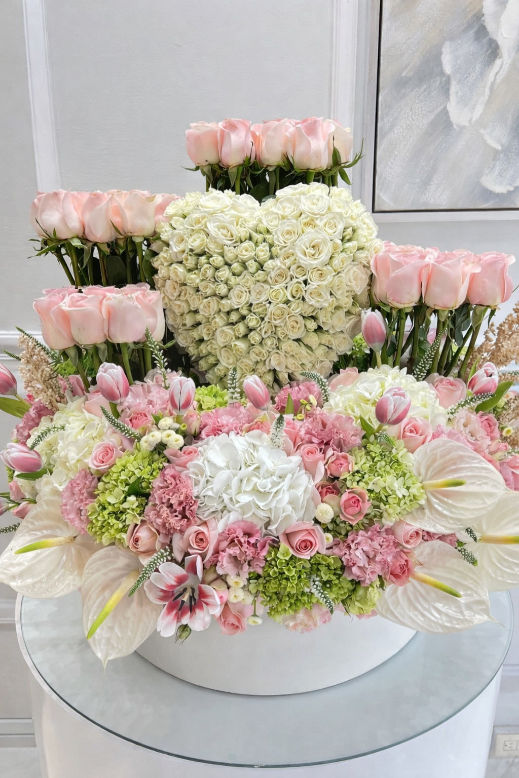 Caja circular 50 cm blanca, con rosas en desnivel, al centro un corazon de mini rosas blancas, y en su base un mix de flores como anturios, tulipanes y hortencias