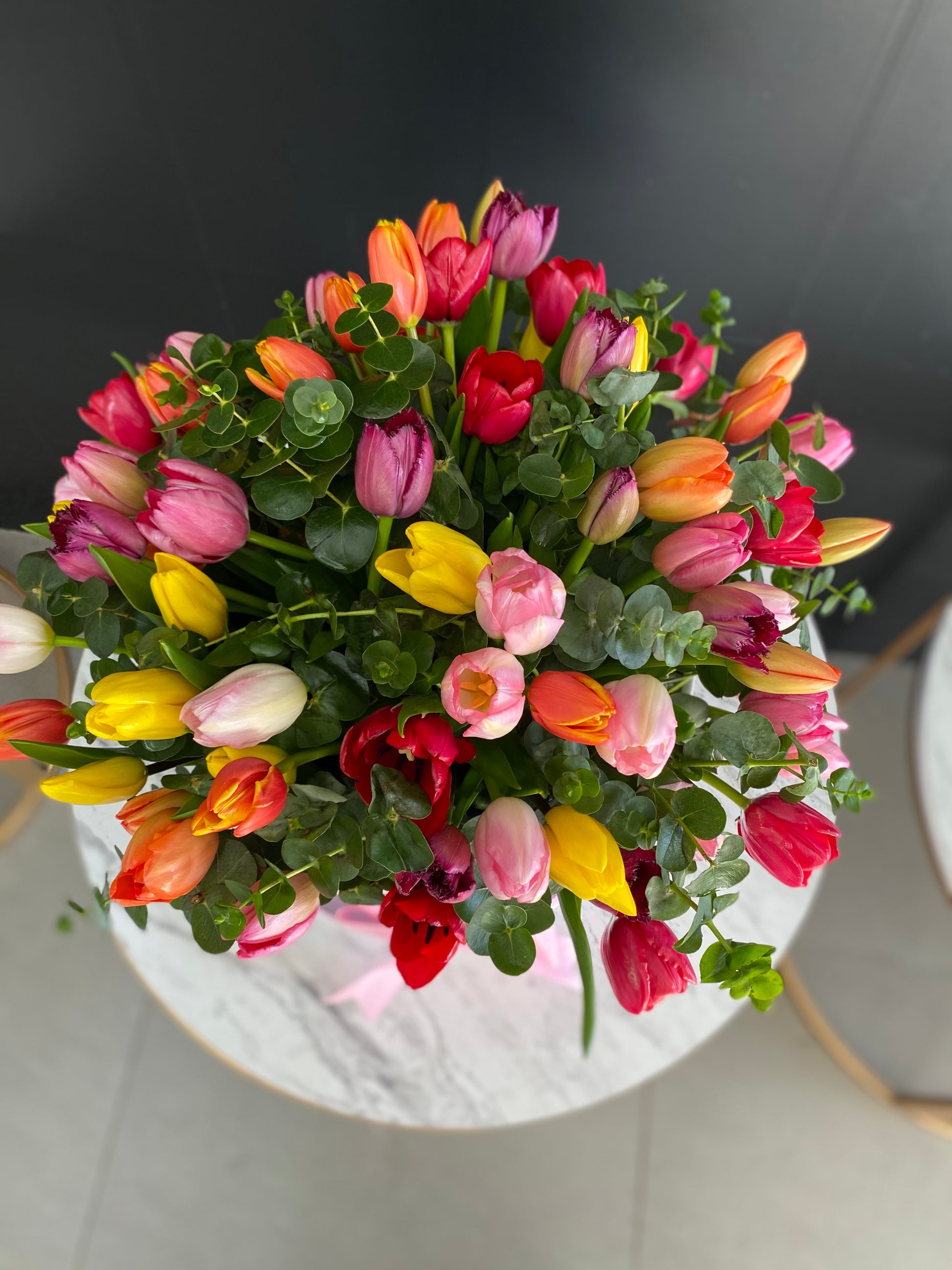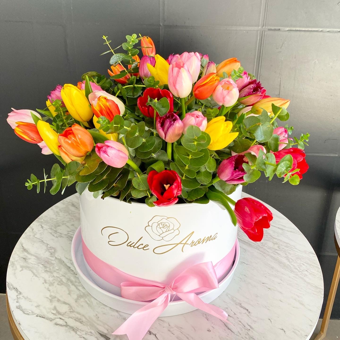 Caja circular 30 cm blanca, 50 tulipanes de colores