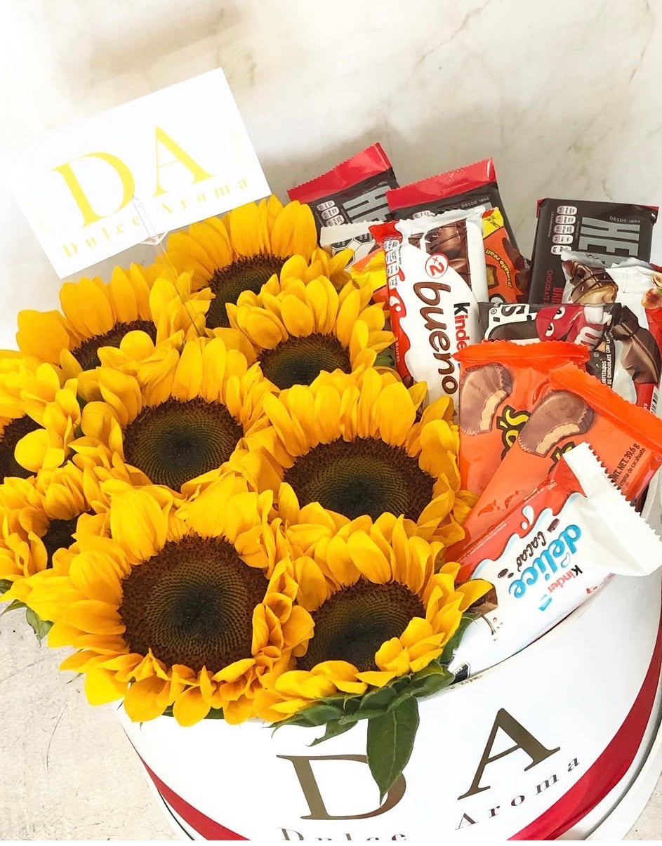 Caja circular blanca 30 cm, mitad girasoles mitad dulces variados
